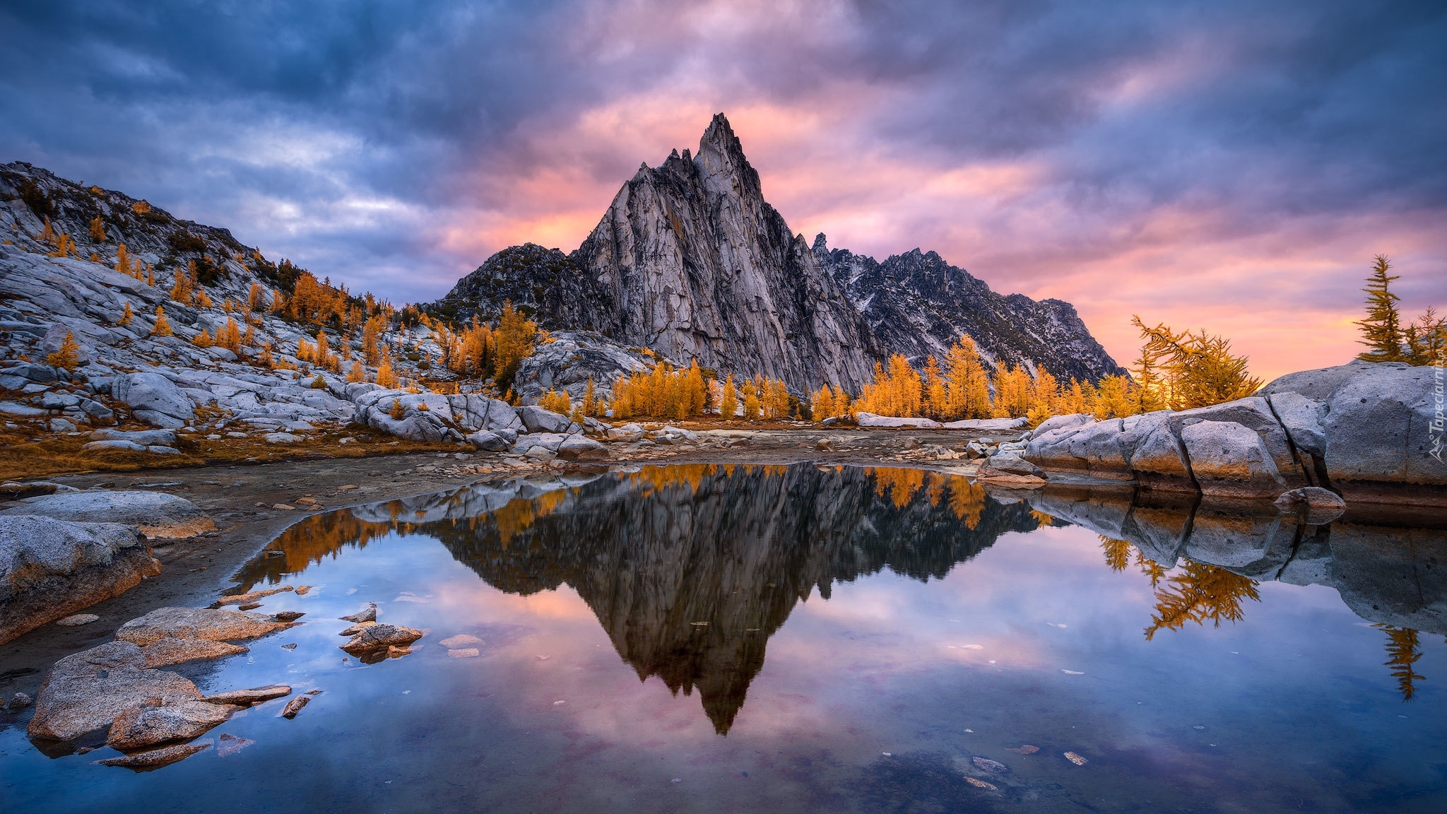 Edytor tapety: Odbicie pożółkłych modrzewi i skał w jeziorze