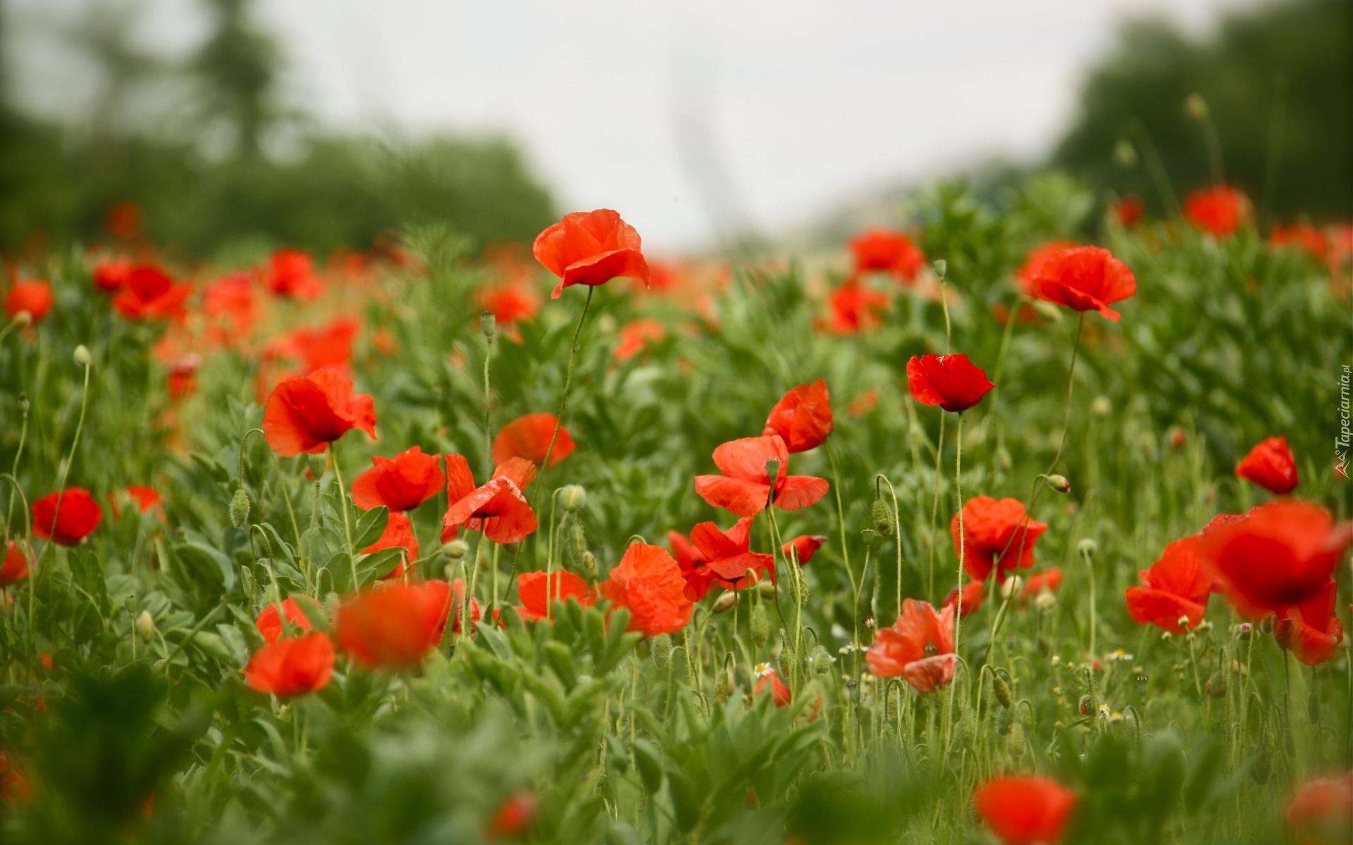 Edytor tapety: Pole czerwonych maków na rozmytym tle