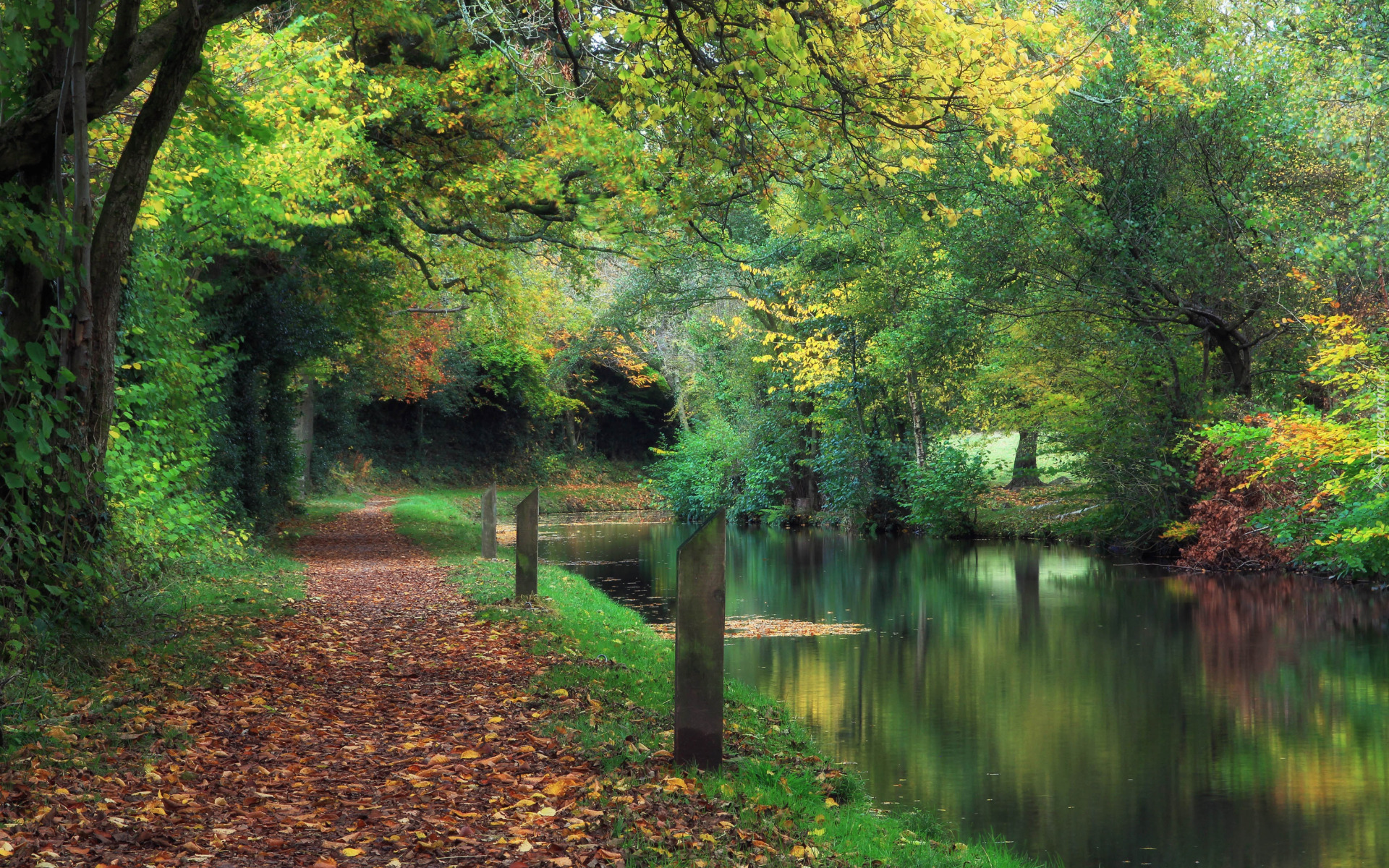 Edytor tapety: Opadłe liście pod drzewami nad rzeką w parku