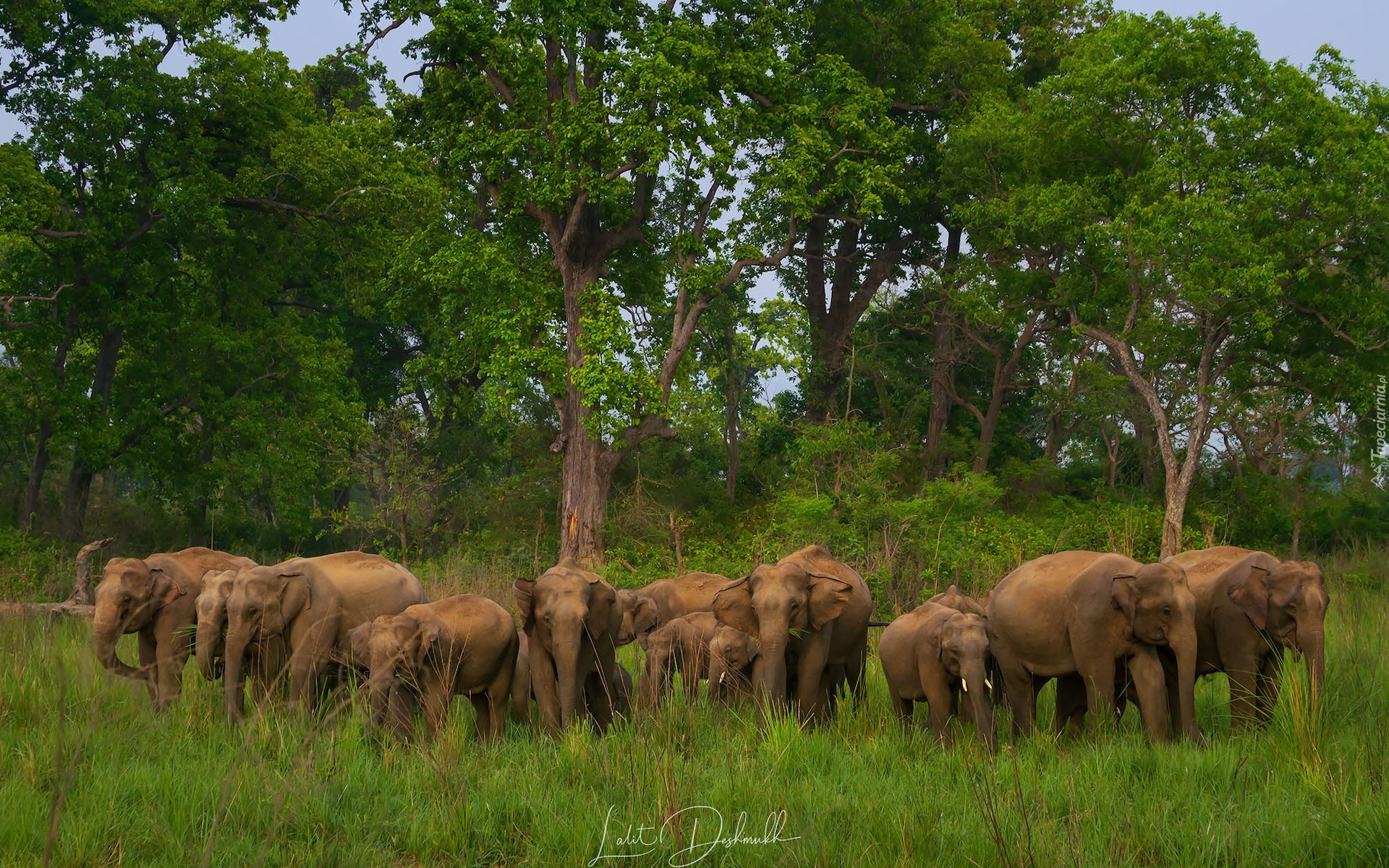 Edytor tapety: Stado słoni na trawie pod drzewami