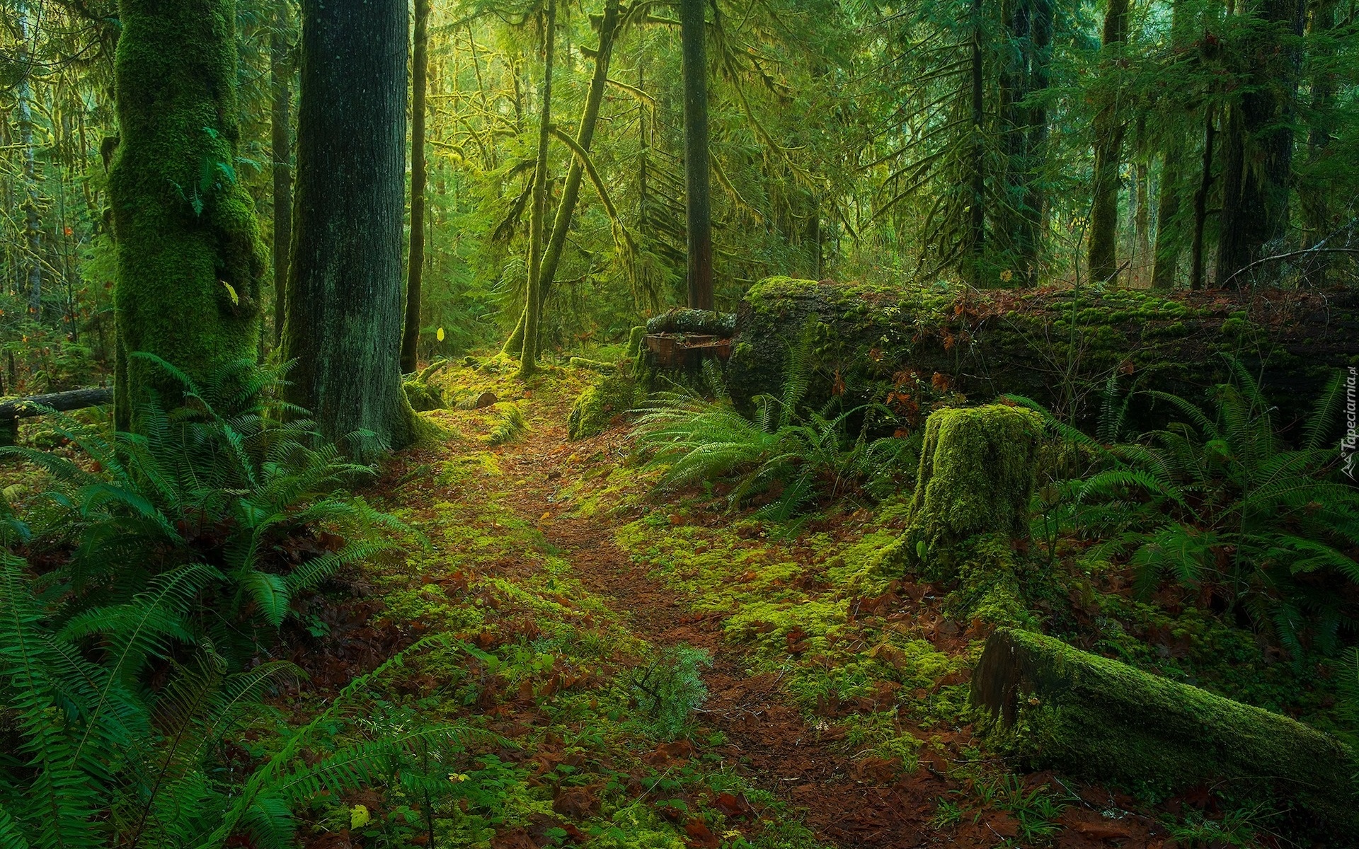 Edytor tapety: Paprocie i omszałe pnie drzew w lesie