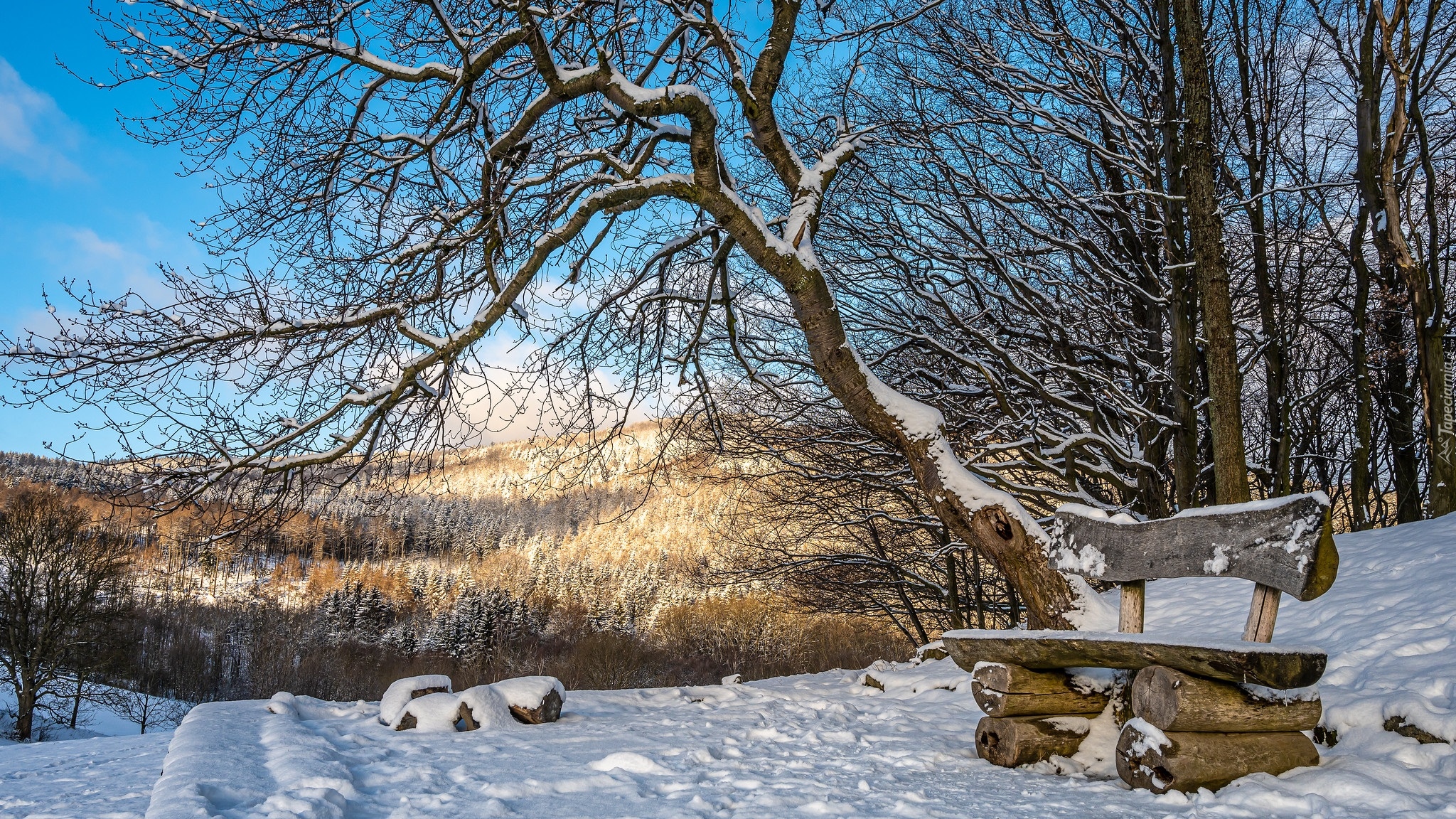 Edytor tapety: Ośnieżona ławka obok pochylonego drzewa