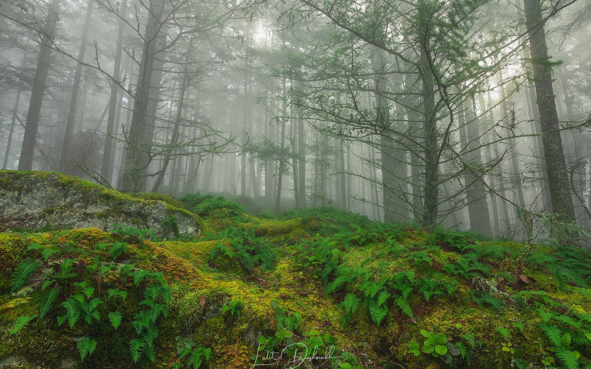 Edytor tapety: Paprocie na omszałych kamieniach w zamglonym lesie