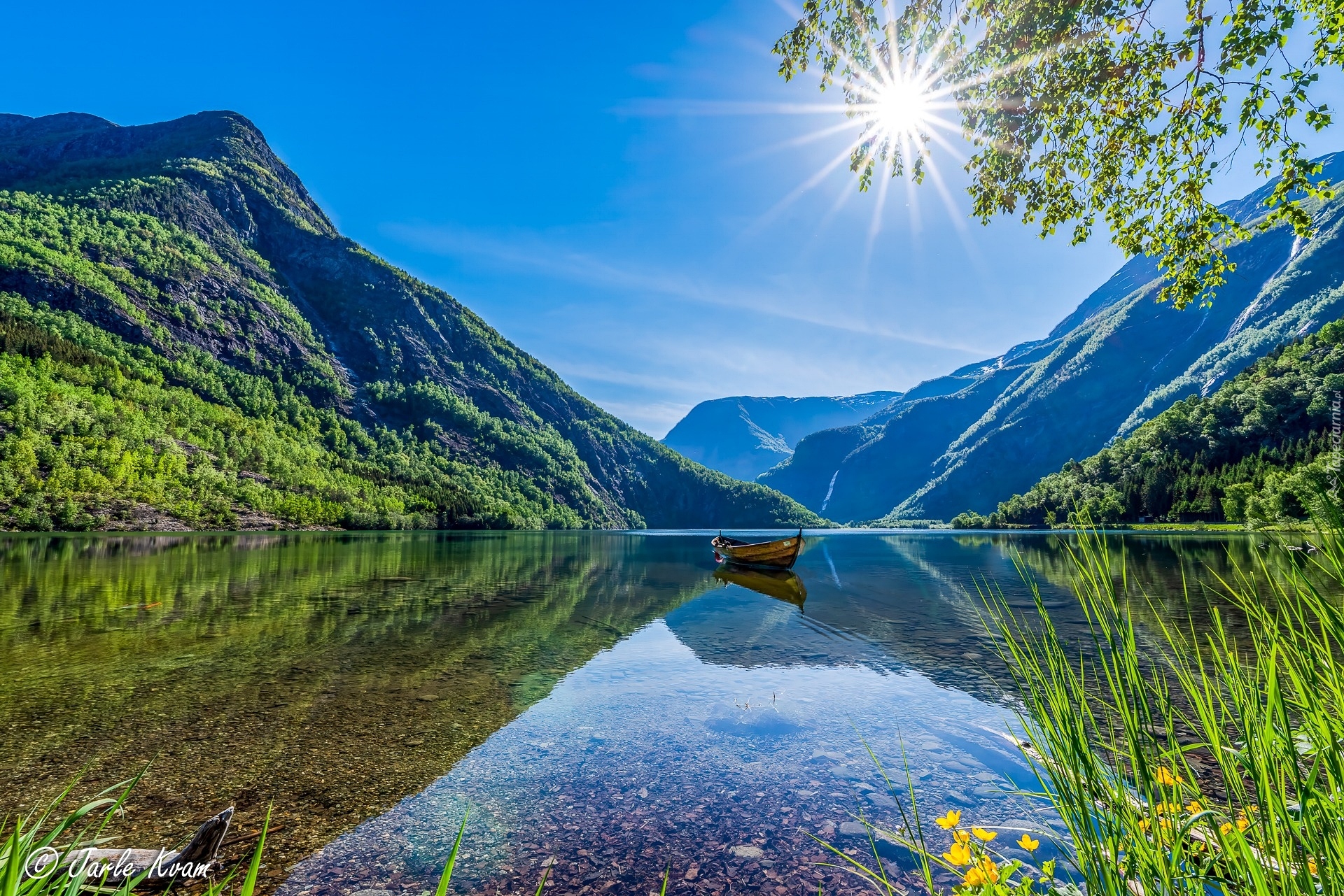 Edytor tapety: Góry i łódka na jeziorze we wsi Skjolden