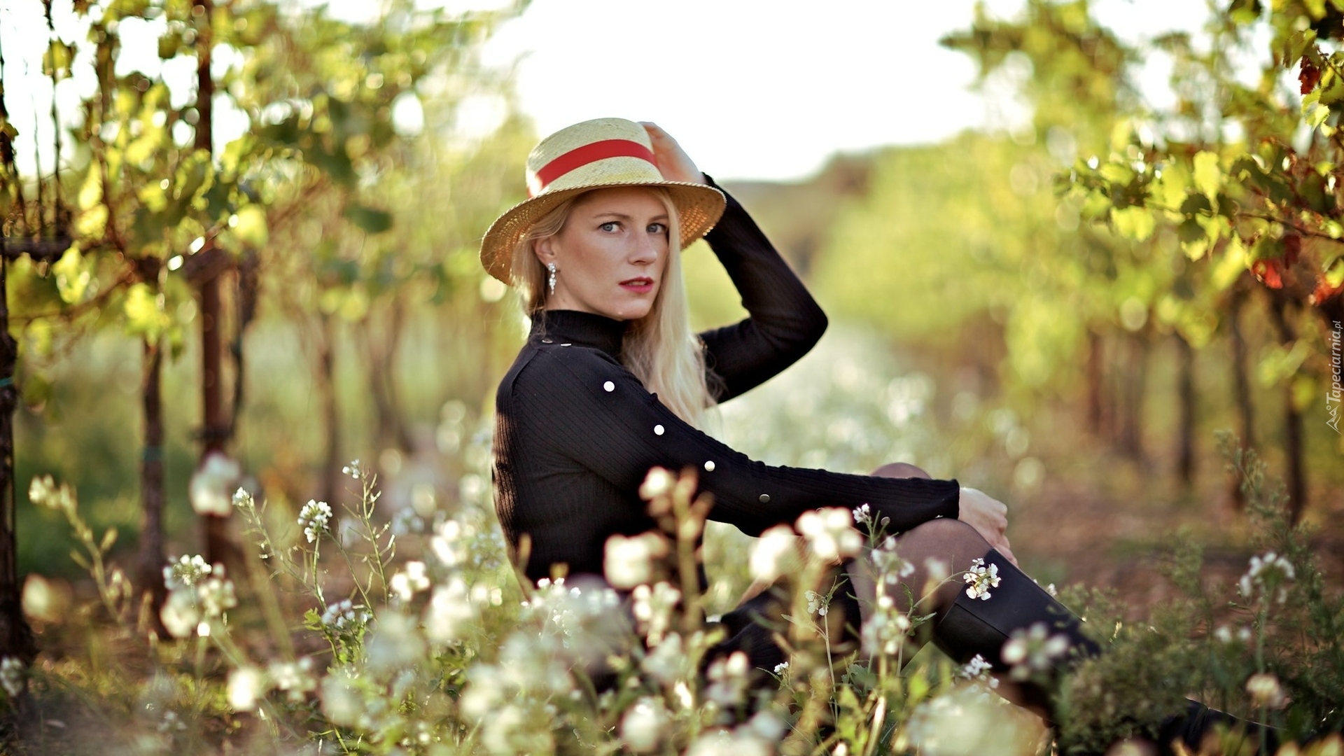 Edytor tapety: Blondynka w kapeluszu i czarnej sukience