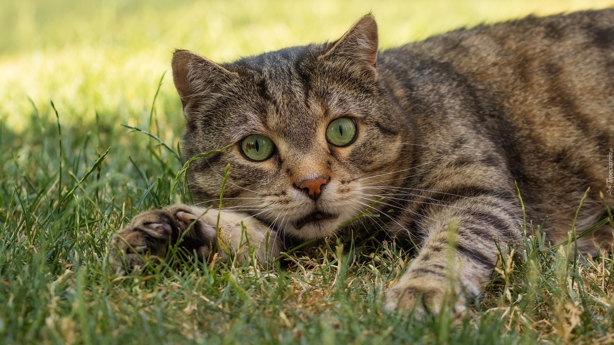 Edytor tapety: Zielonooki kot odpoczywający na trawie