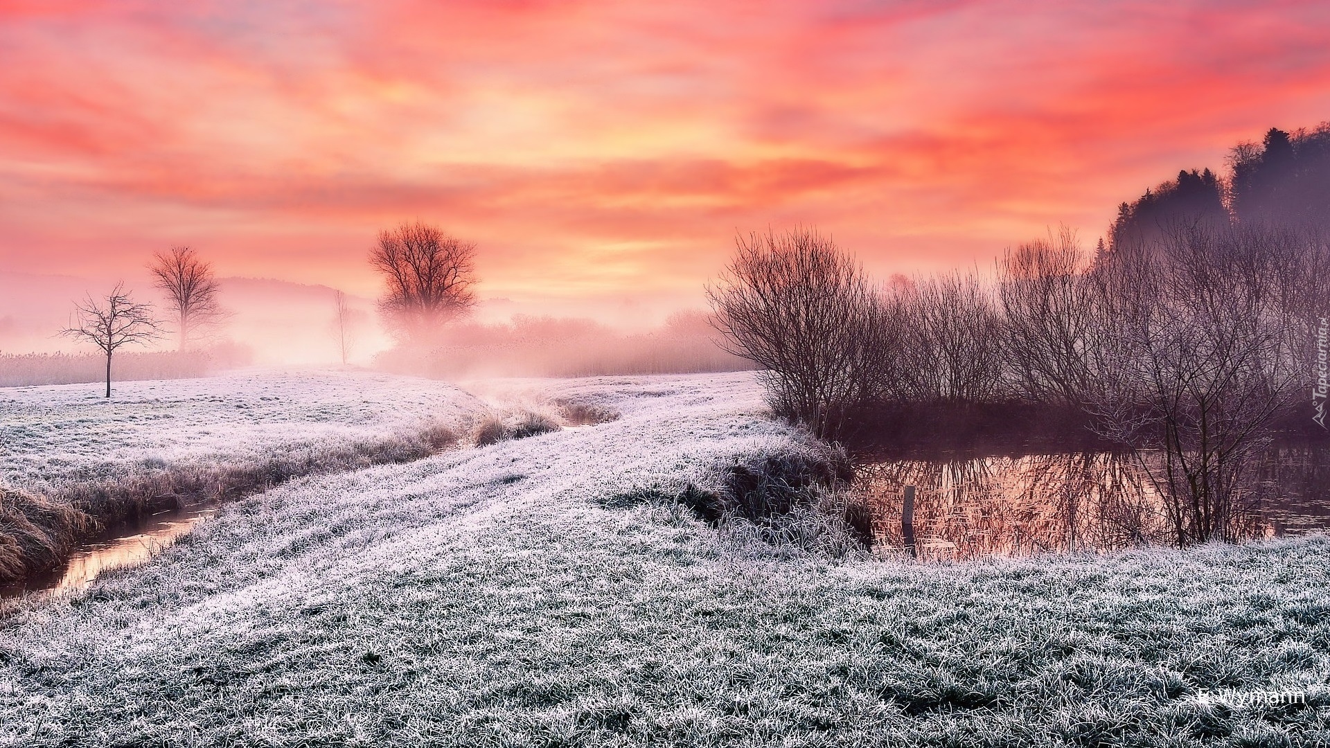 Edytor tapety: Kolorowe niebo nad zamgloną oszronioną łąką nad rzeką