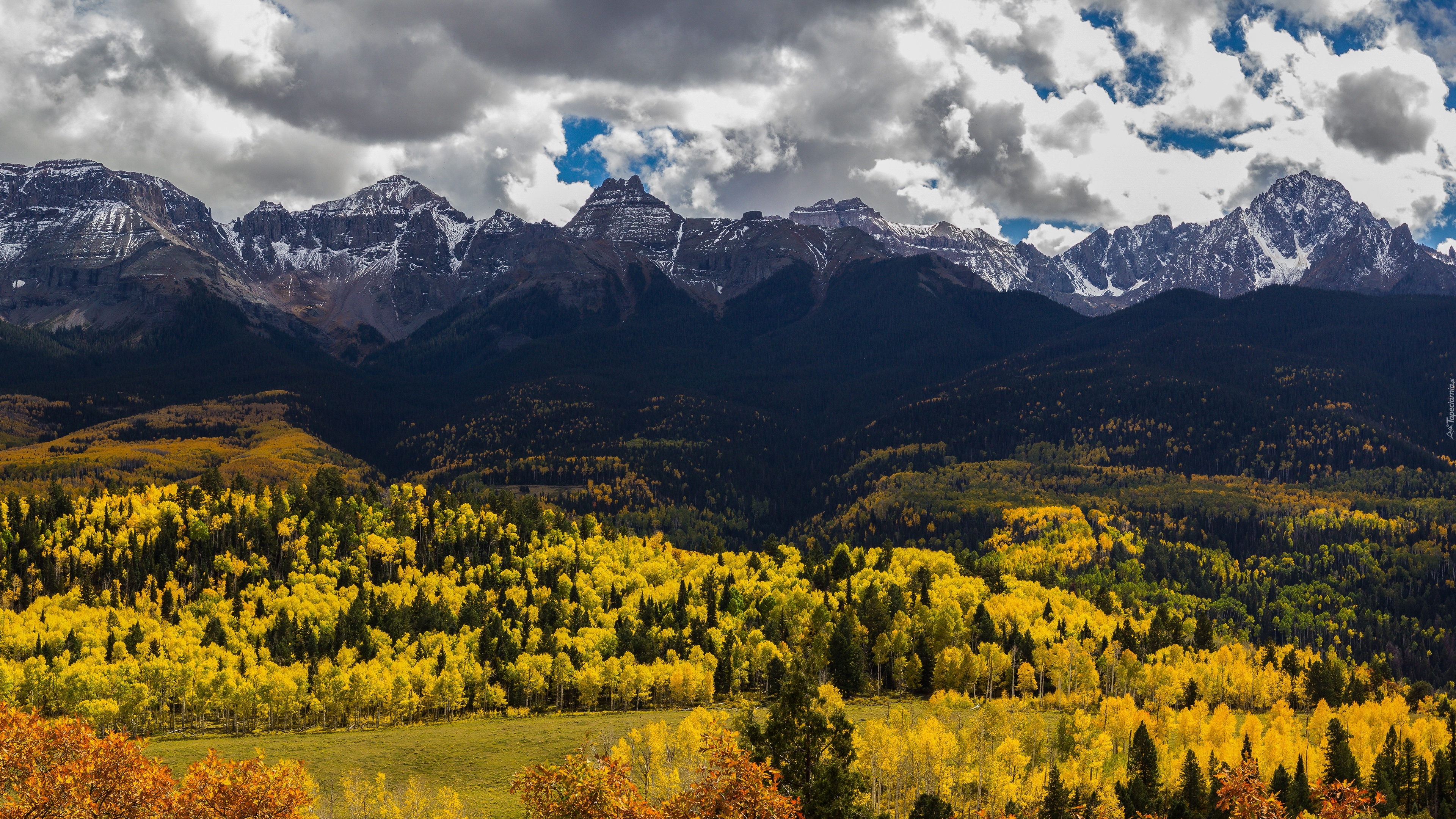 Edytor tapety: Chmury kłębiaste nad górami i pożółkłymi drzewami