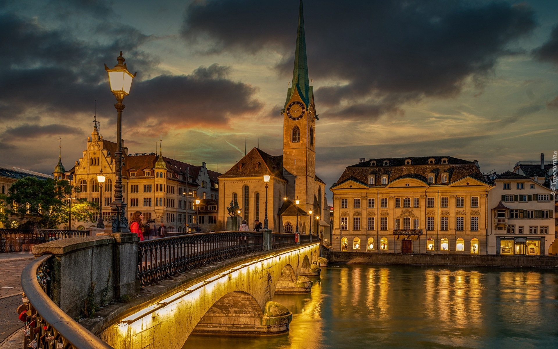 Edytor tapety: Podświetlony most nad rzeką Limmat w Zurychu