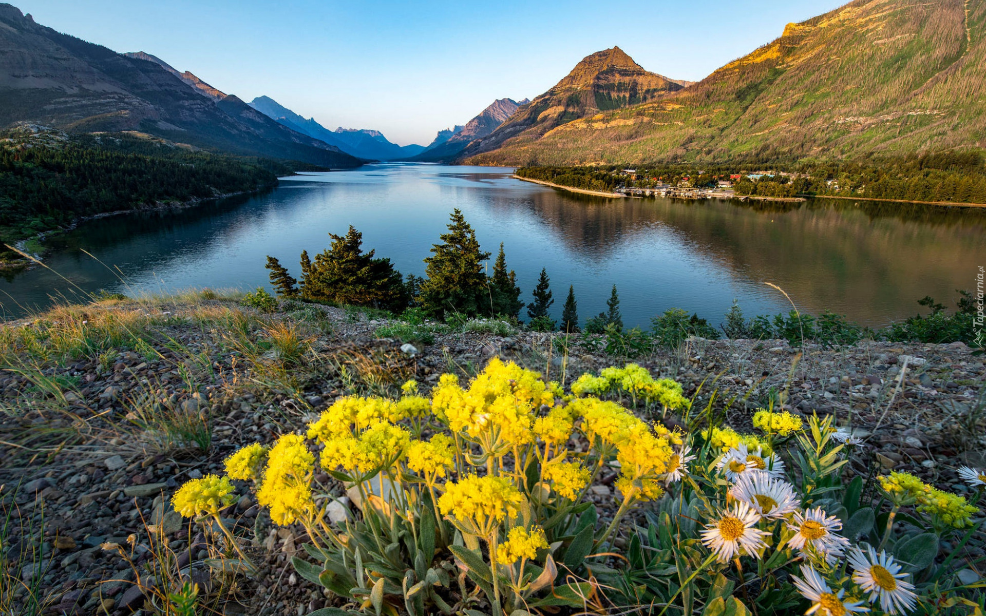 Edytor tapety: Żółte kwiaty i górskie jezioro w oddali