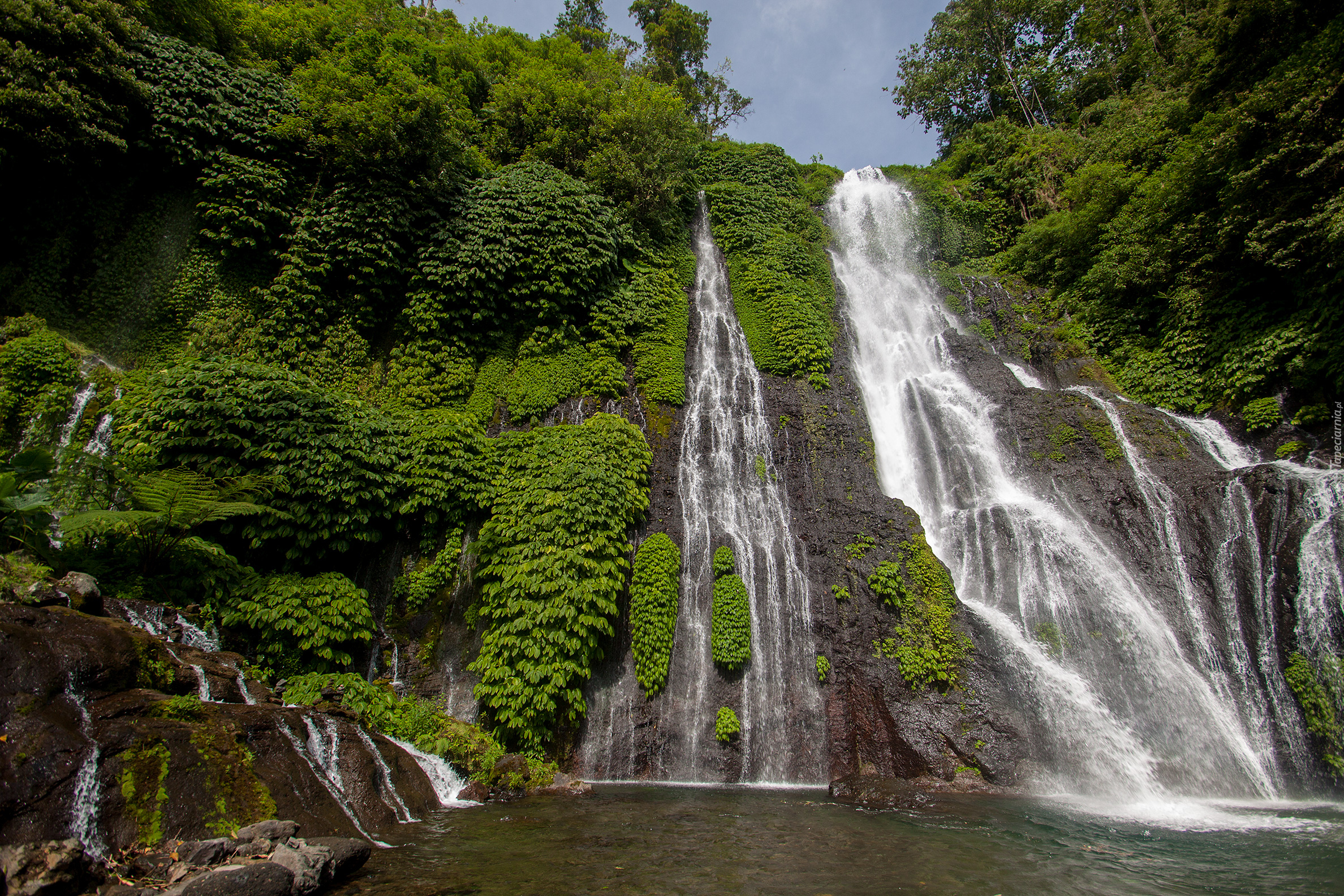 Edytor tapety: Rośliny i drzewa na skałach przy wodospadzie