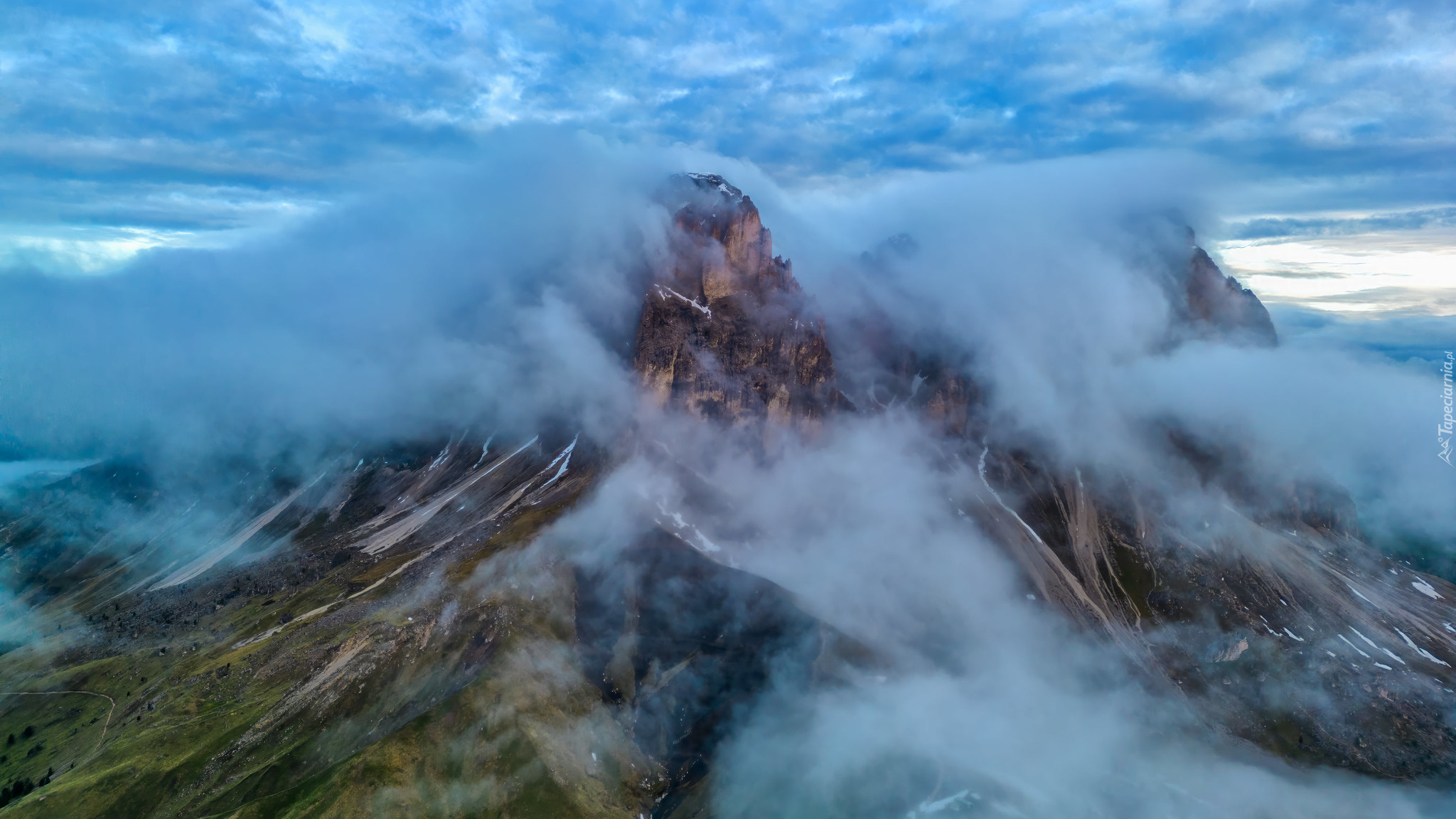 Edytor tapety: Poranna mgła nad Dolomitami i przełęczą Sella Pass