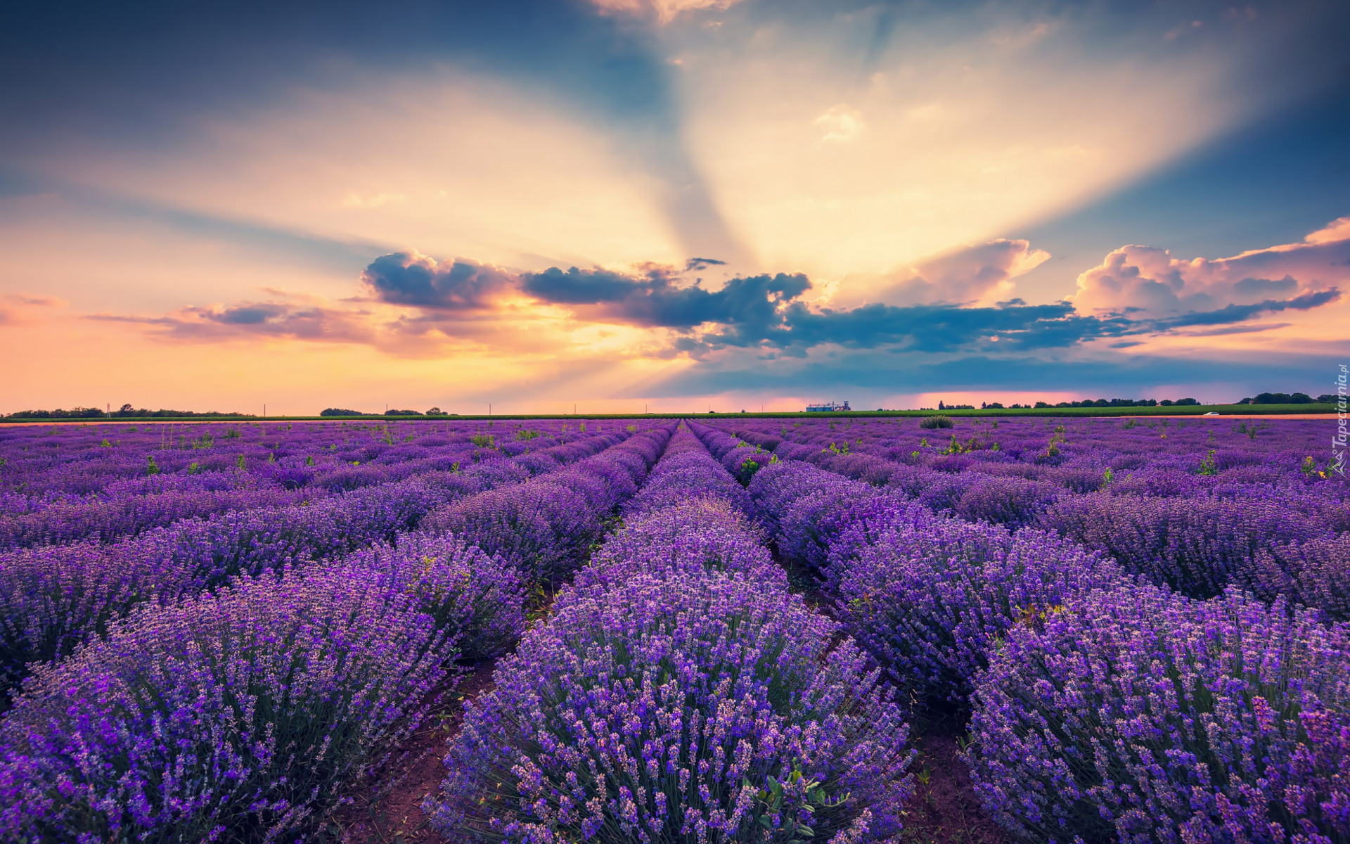 Edytor tapety: Kwitnąca lawenda na polu o wschodzie słońca
