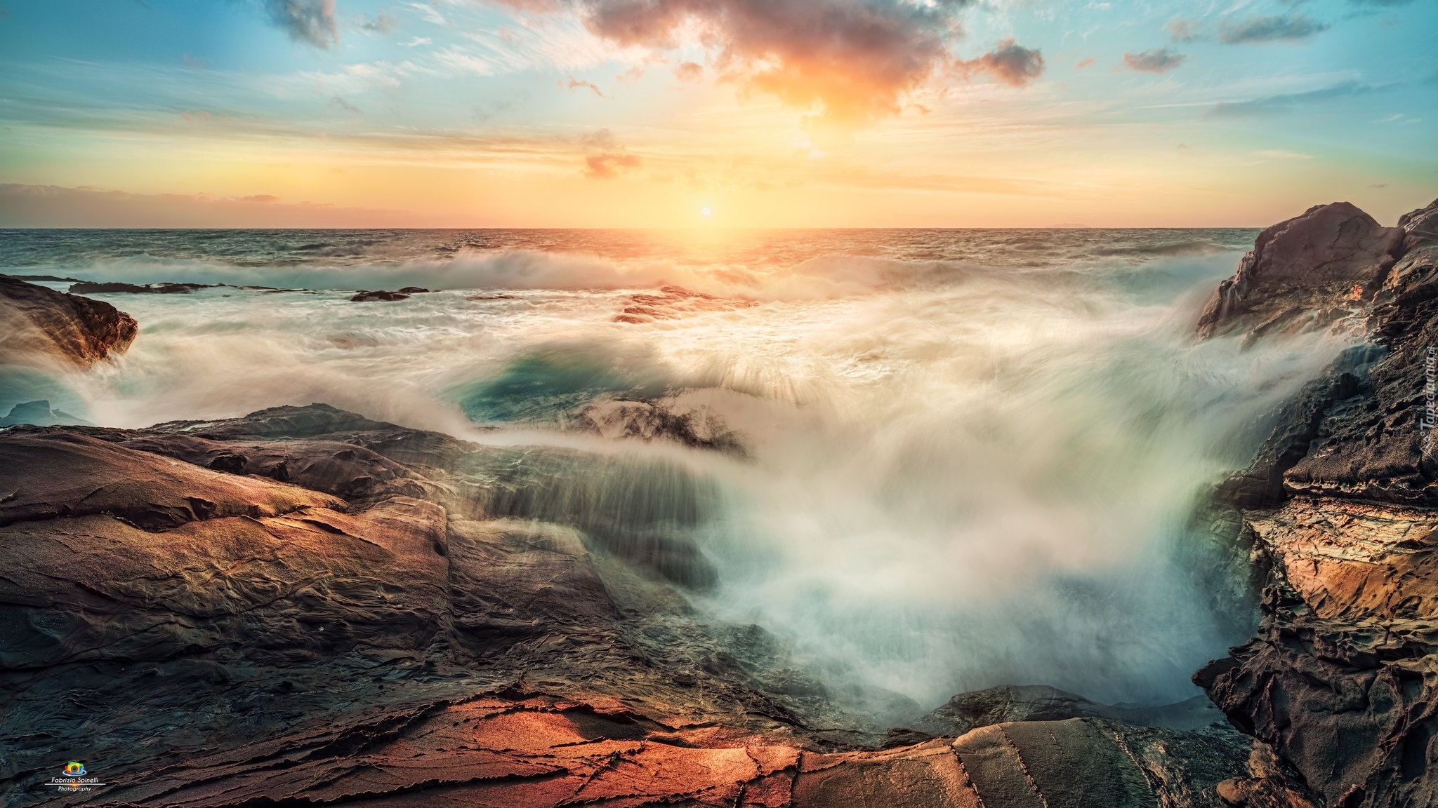 Edytor tapety: Wzburzone fale na skalistym wybrzeżu morza