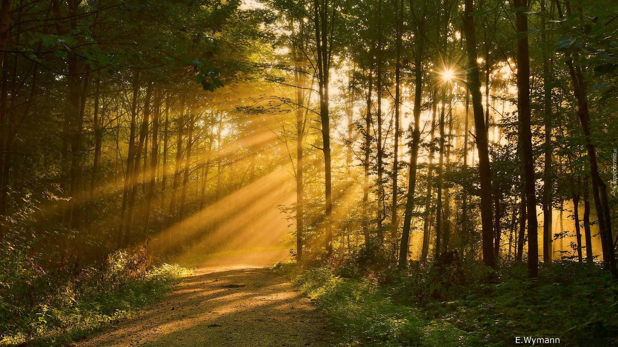 Edytor tapety: Las i ścieżka leśna w promieniach słońca