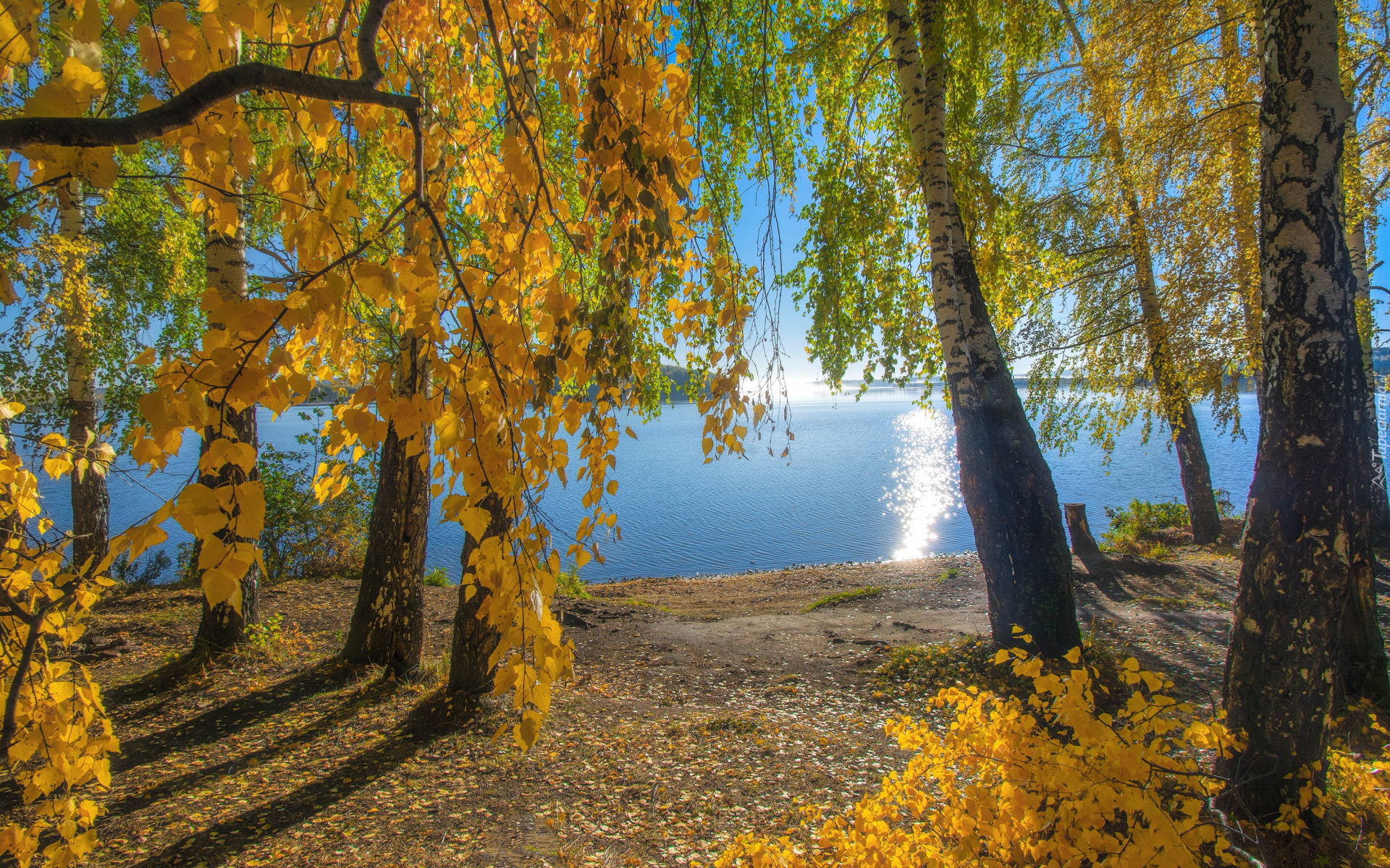 Edytor tapety: Brzozy nad jeziorem w słonecznym blasku