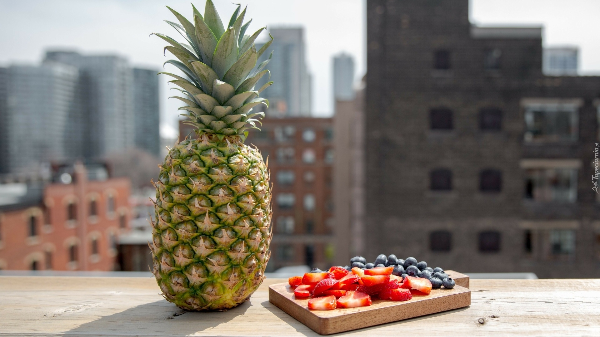 Edytor tapety: Ananas obok truskawek i borówek na desce