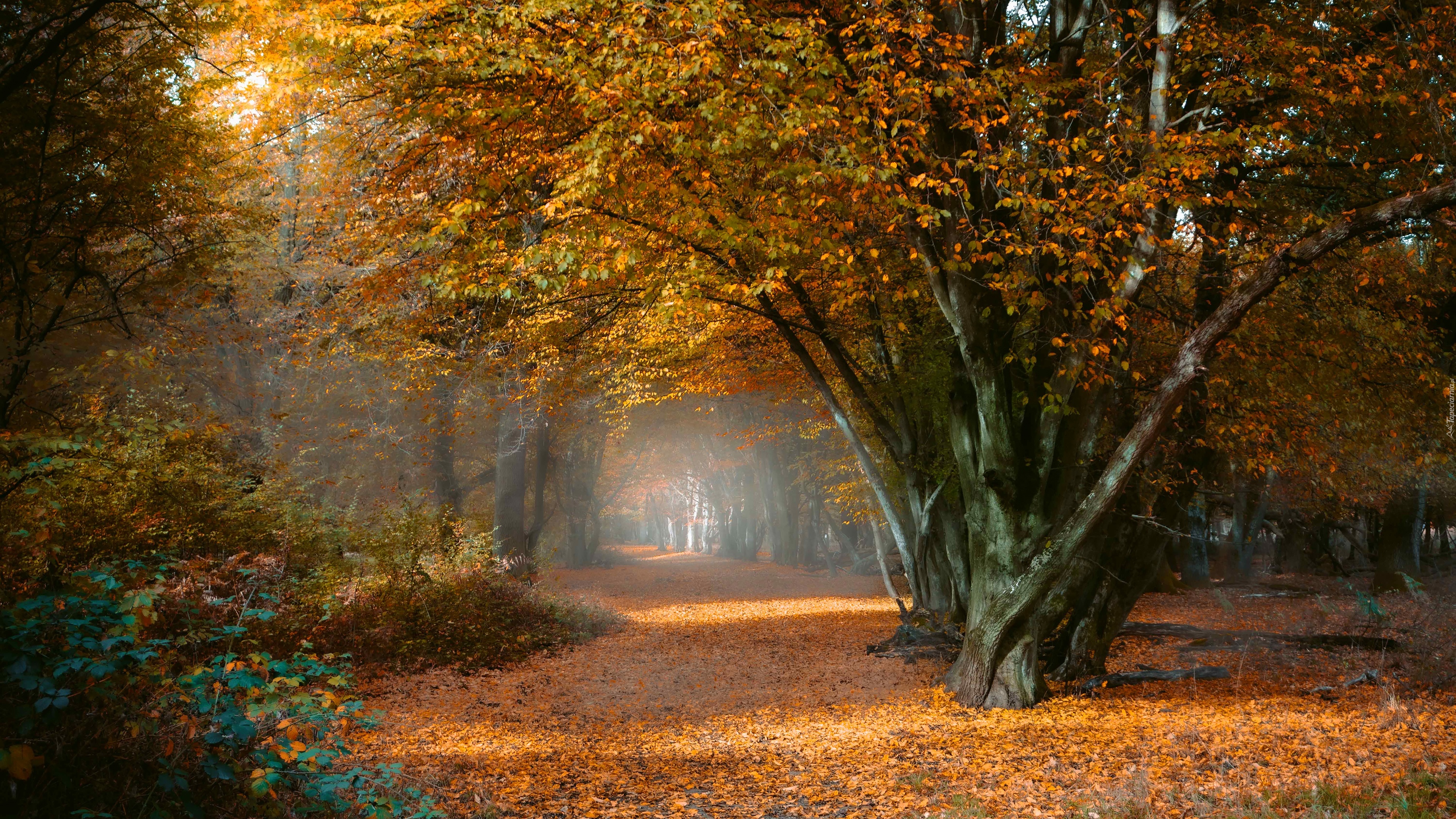 Edytor tapety: Ścieżka pośród jesiennych drzew w zamglonym parku