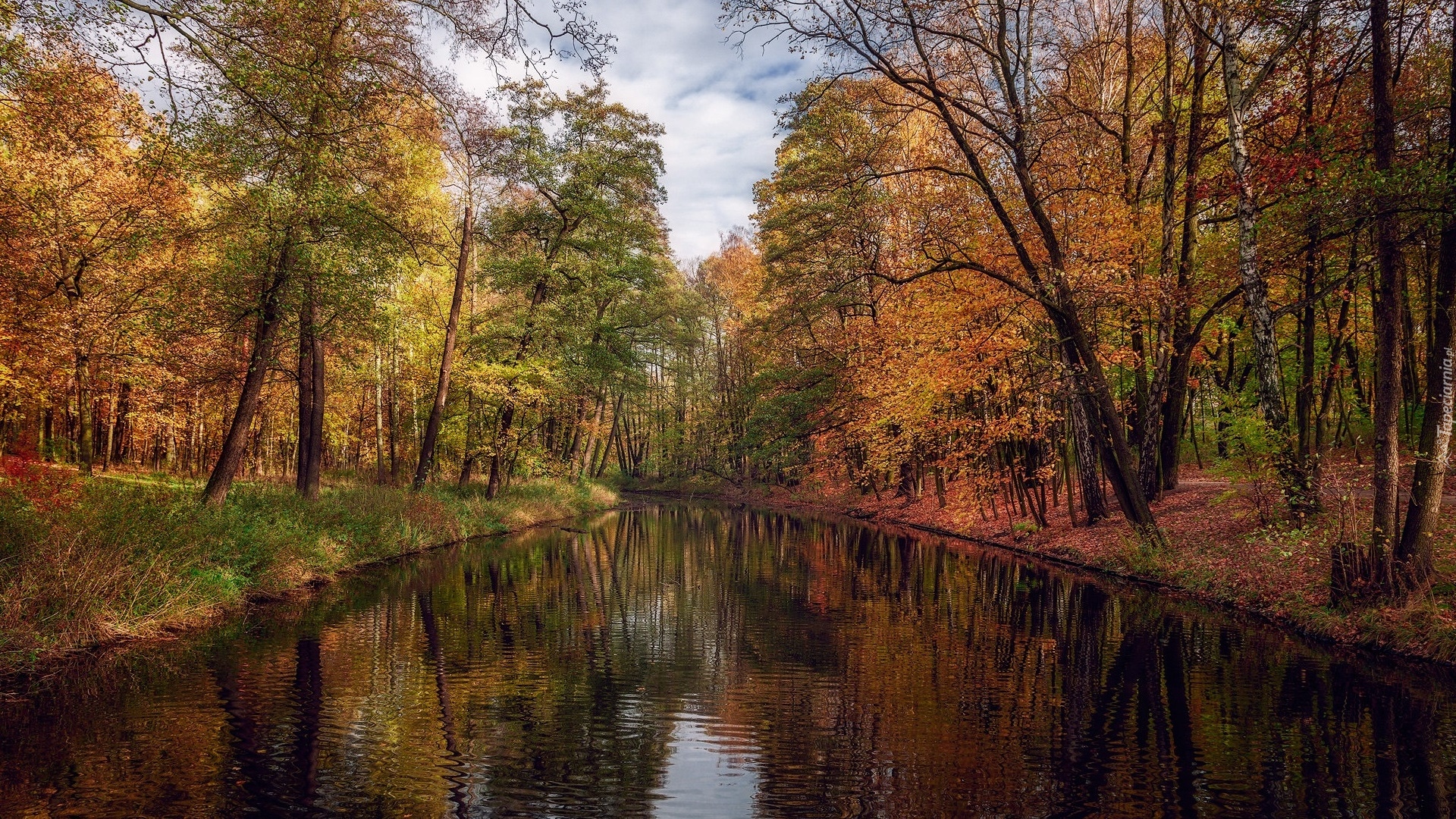 Edytor tapety: Jesienne drzewa po obu stronach rzeki w parku