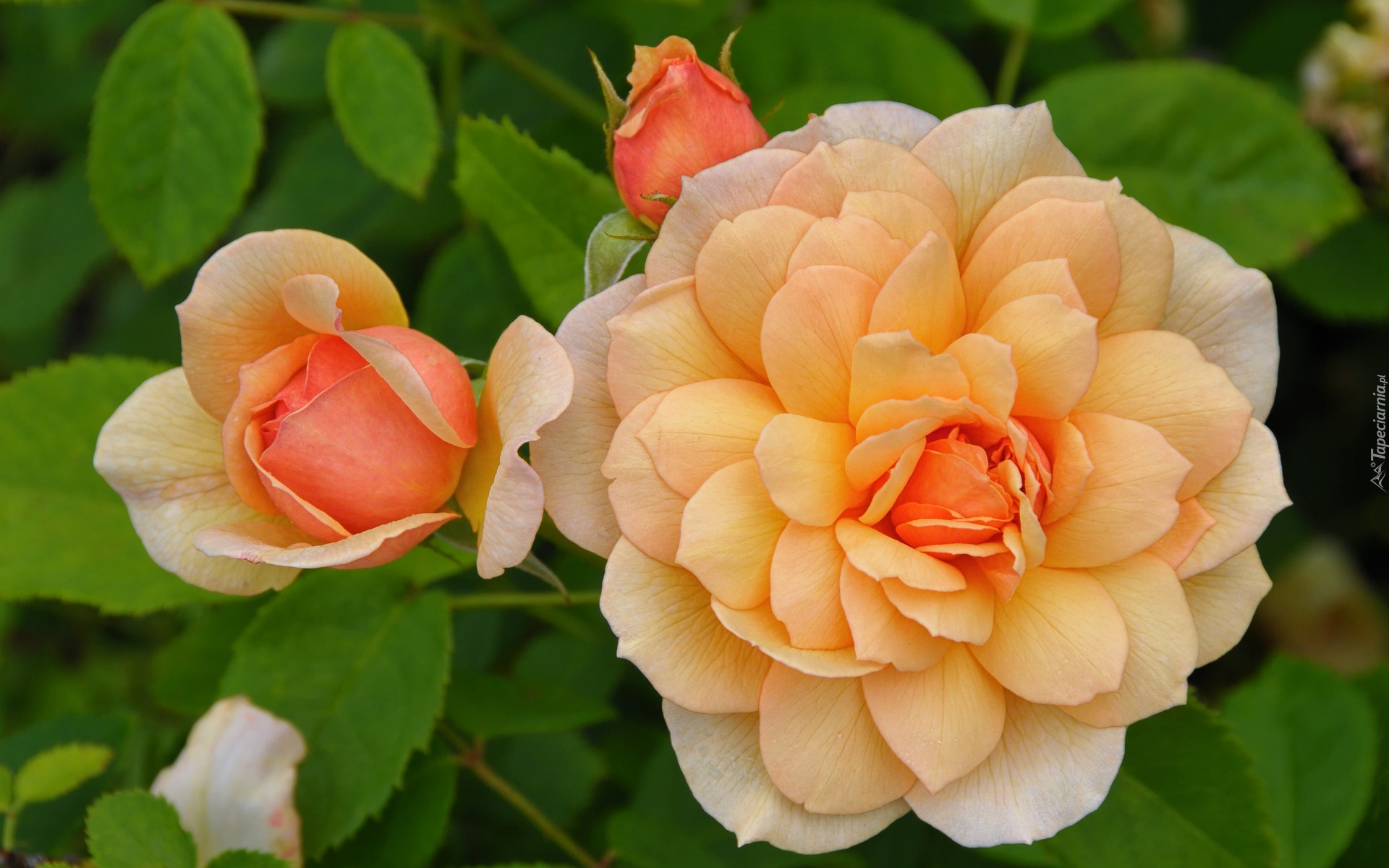 Edytor tapety: Rozkwitnięta róża i pąki z liśćmi