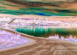 Edytor tapety: Kolorowe niebo nad jeziorem i drogą