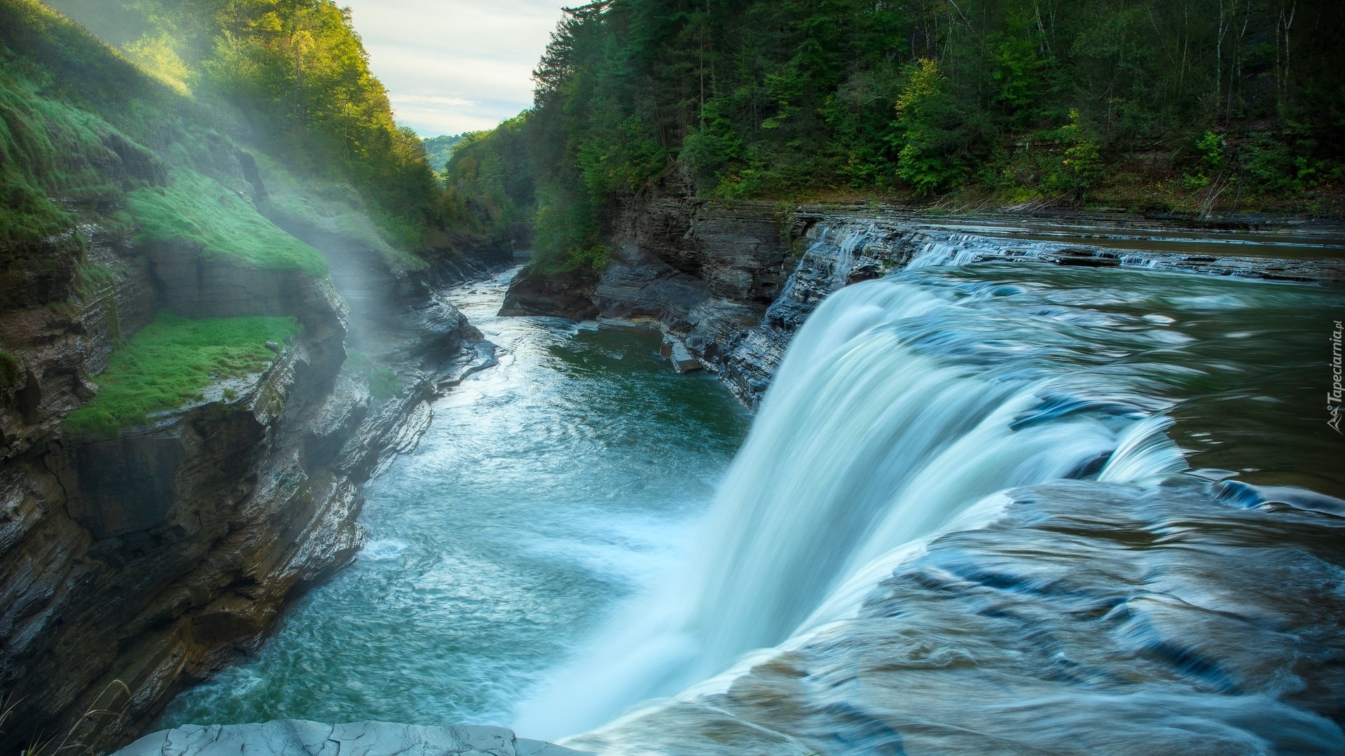 Edytor tapety: Drzewa na skałach przy wodospadzie wpadającym do rzeki