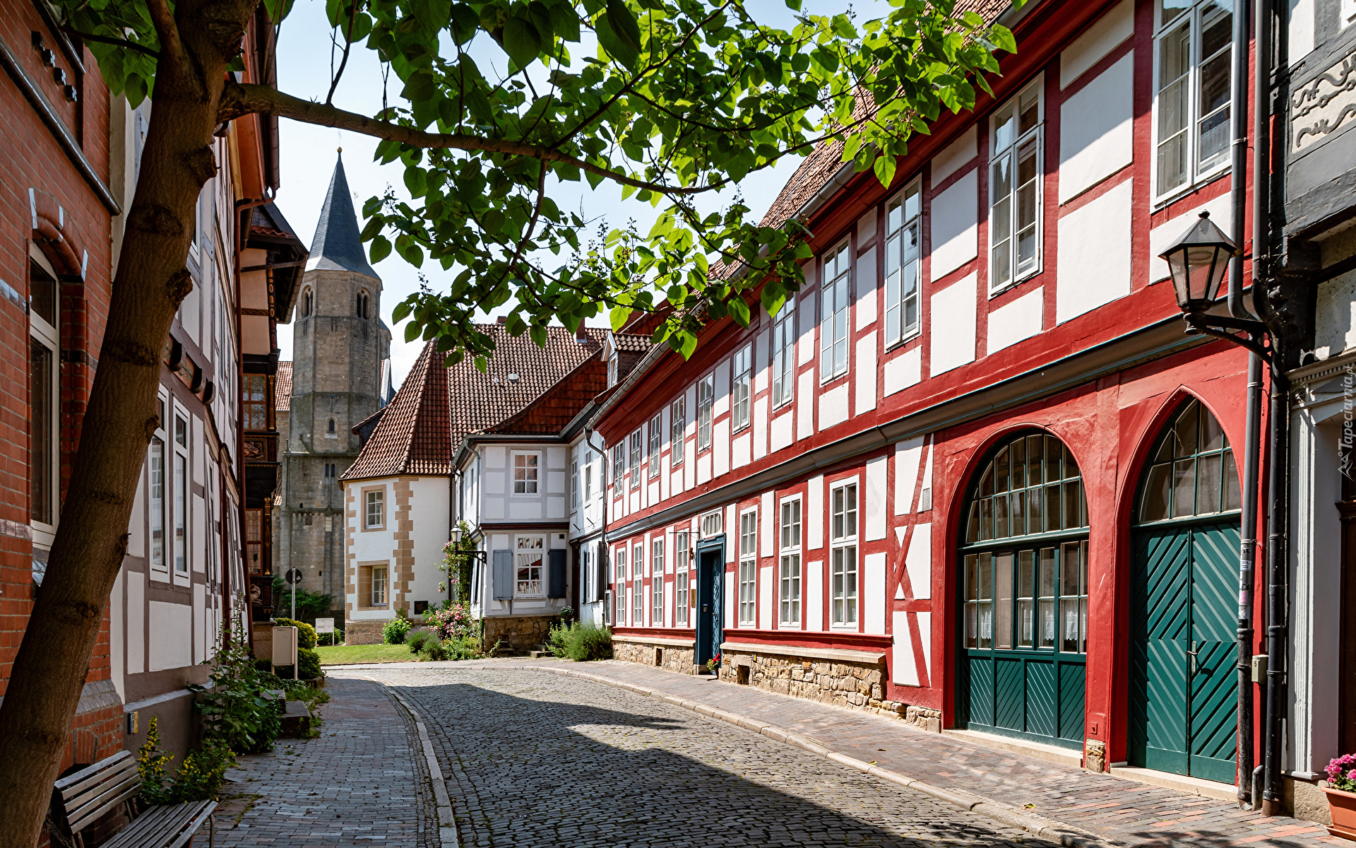 Edytor tapety: Domy i drzewo przy brukowej uliczce