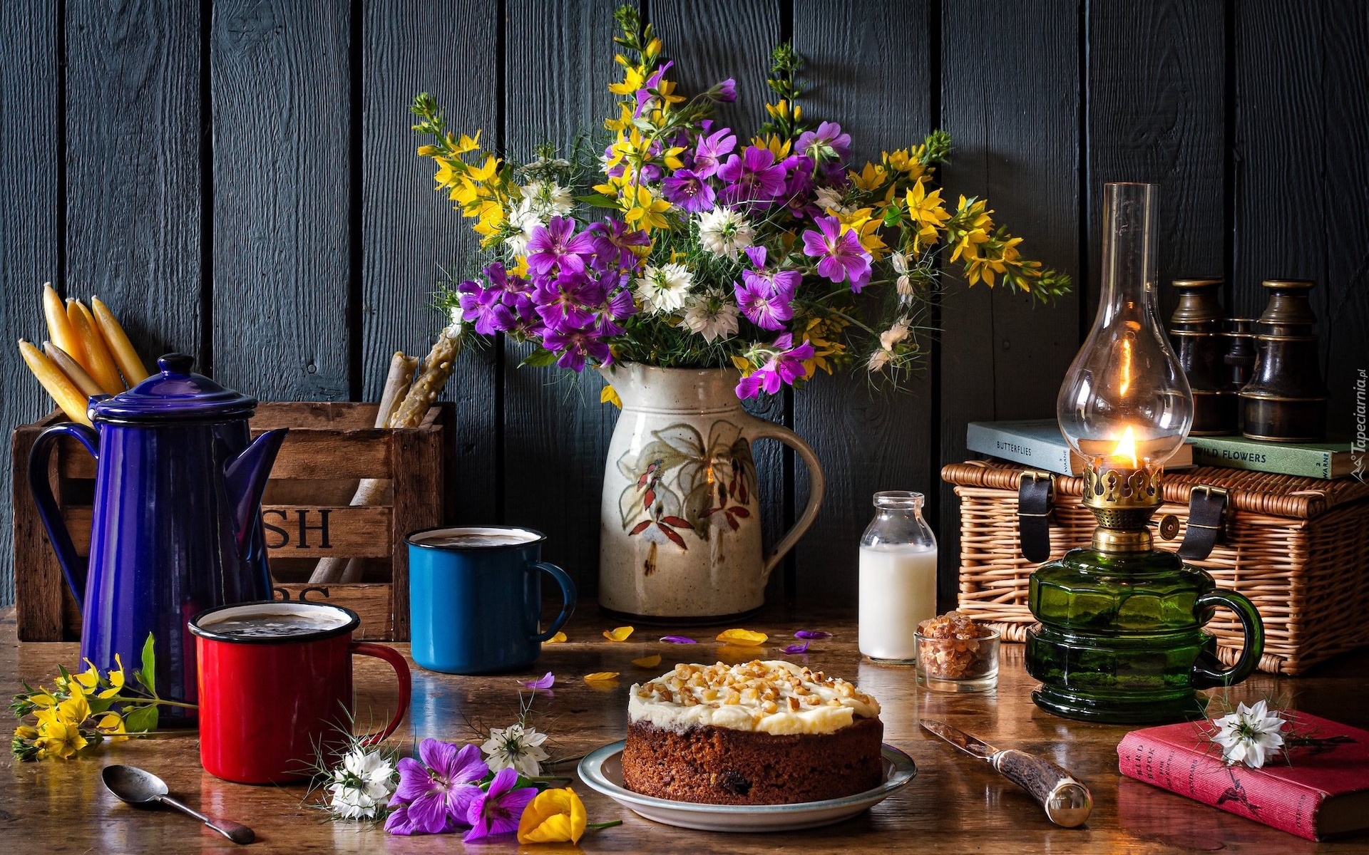 Edytor tapety: Polne kwiaty w dzbanku obok lampy i ciasta