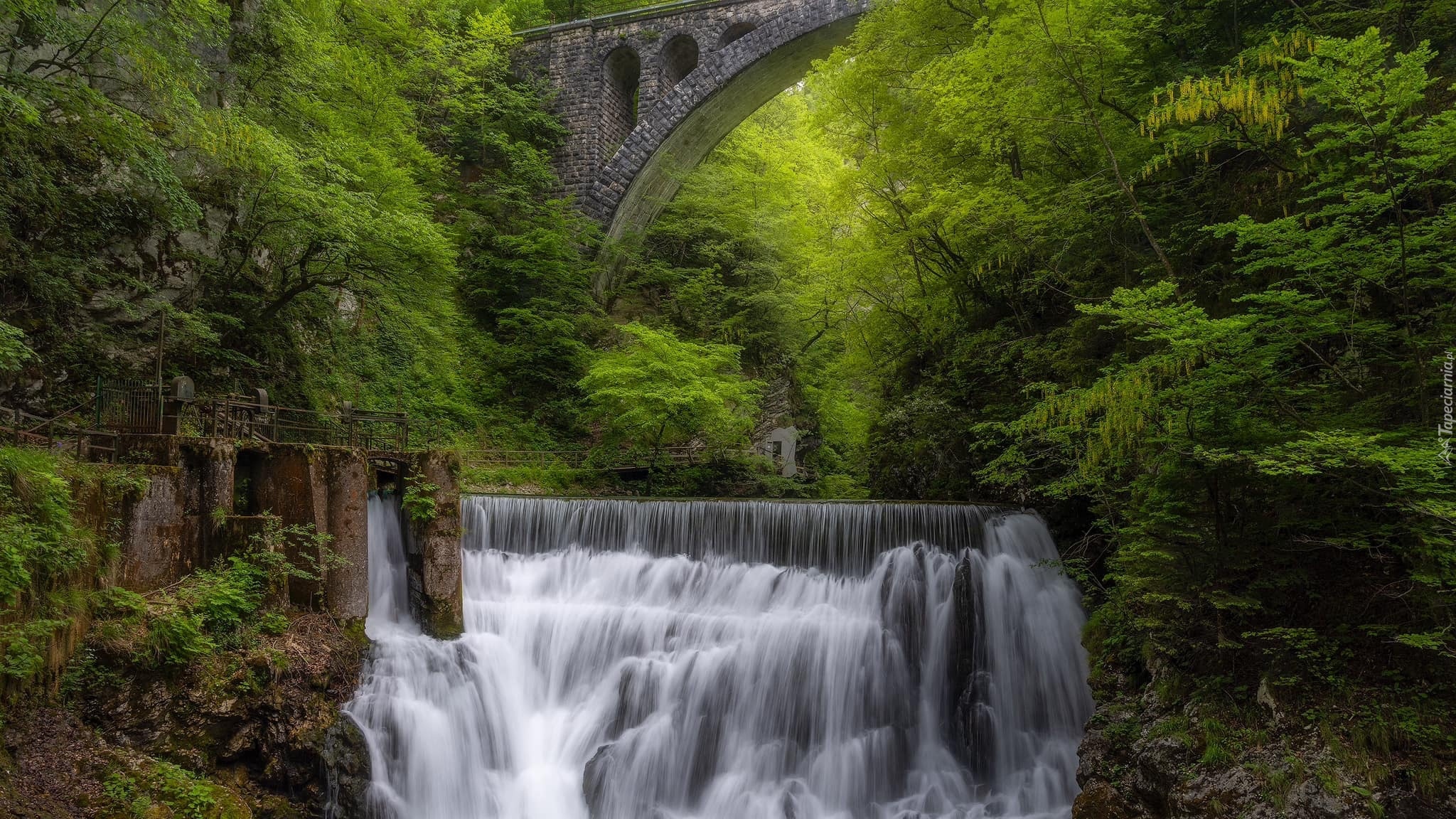 Edytor tapety: Kamienny most nad rzeką w zielonym lesie