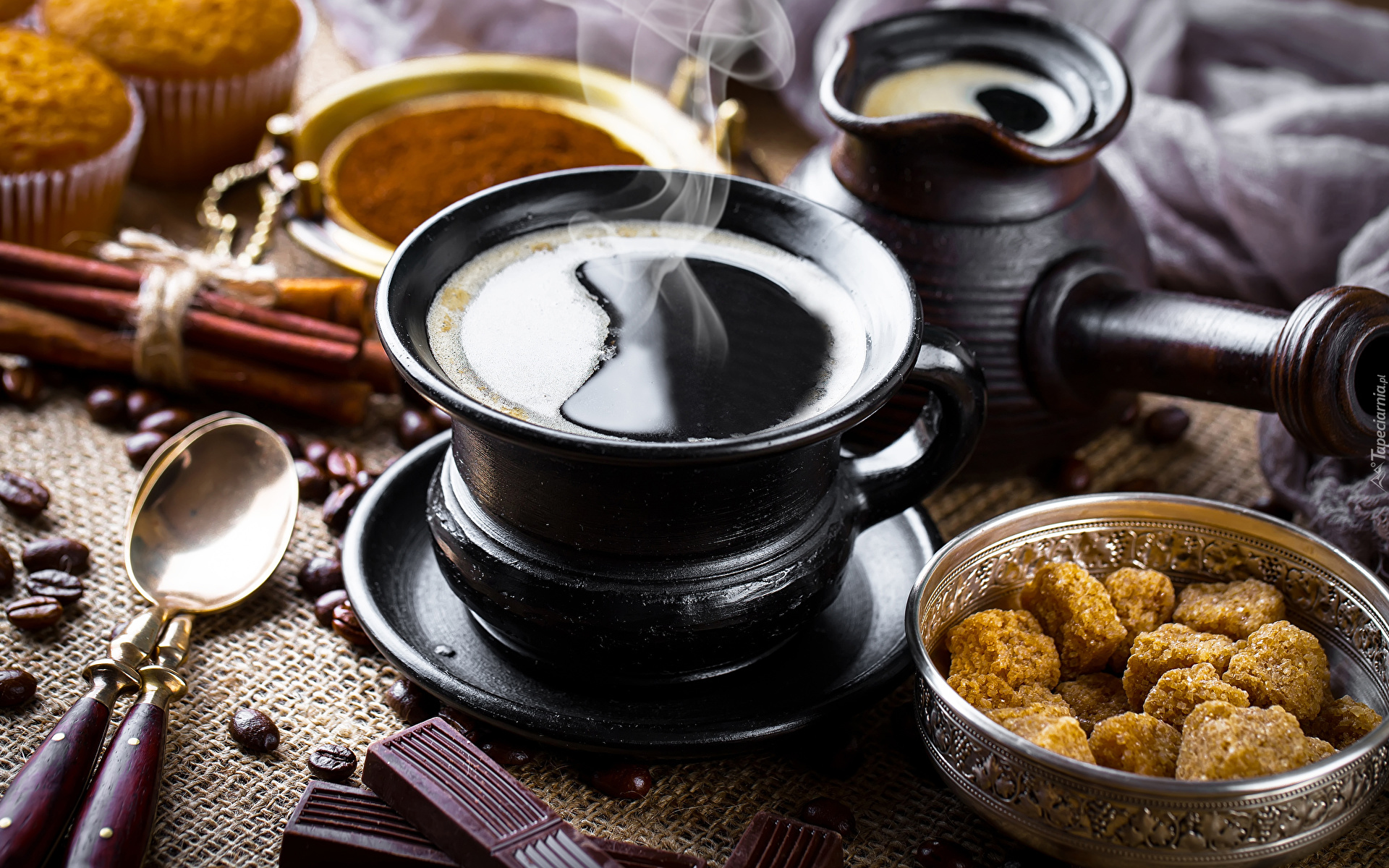 Edytor tapety: Filiżanka kawy obok kostek cukru brązowego
