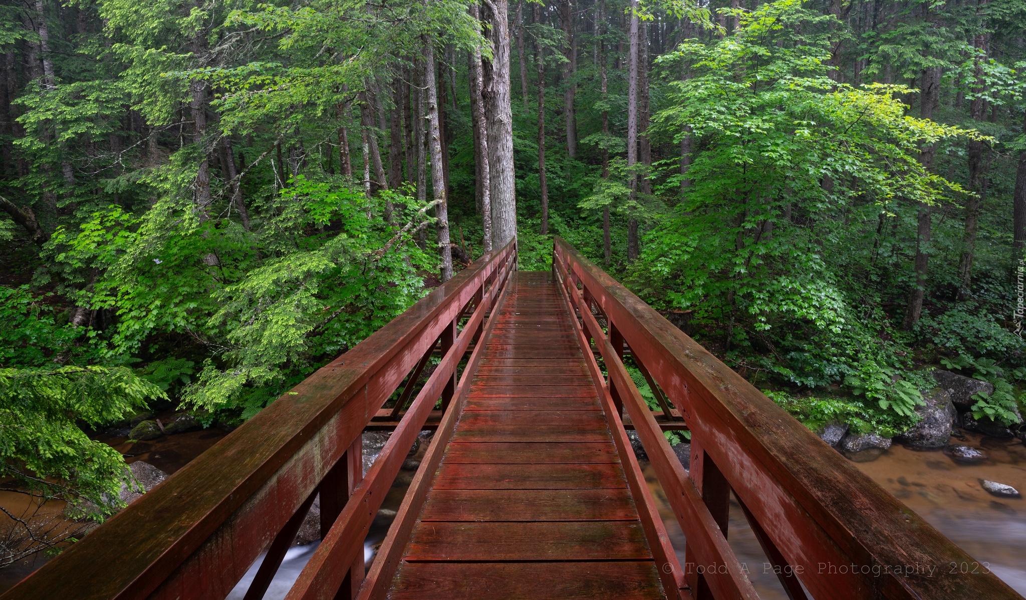 Edytor tapety: Drewniany most nad rzeką w lesie