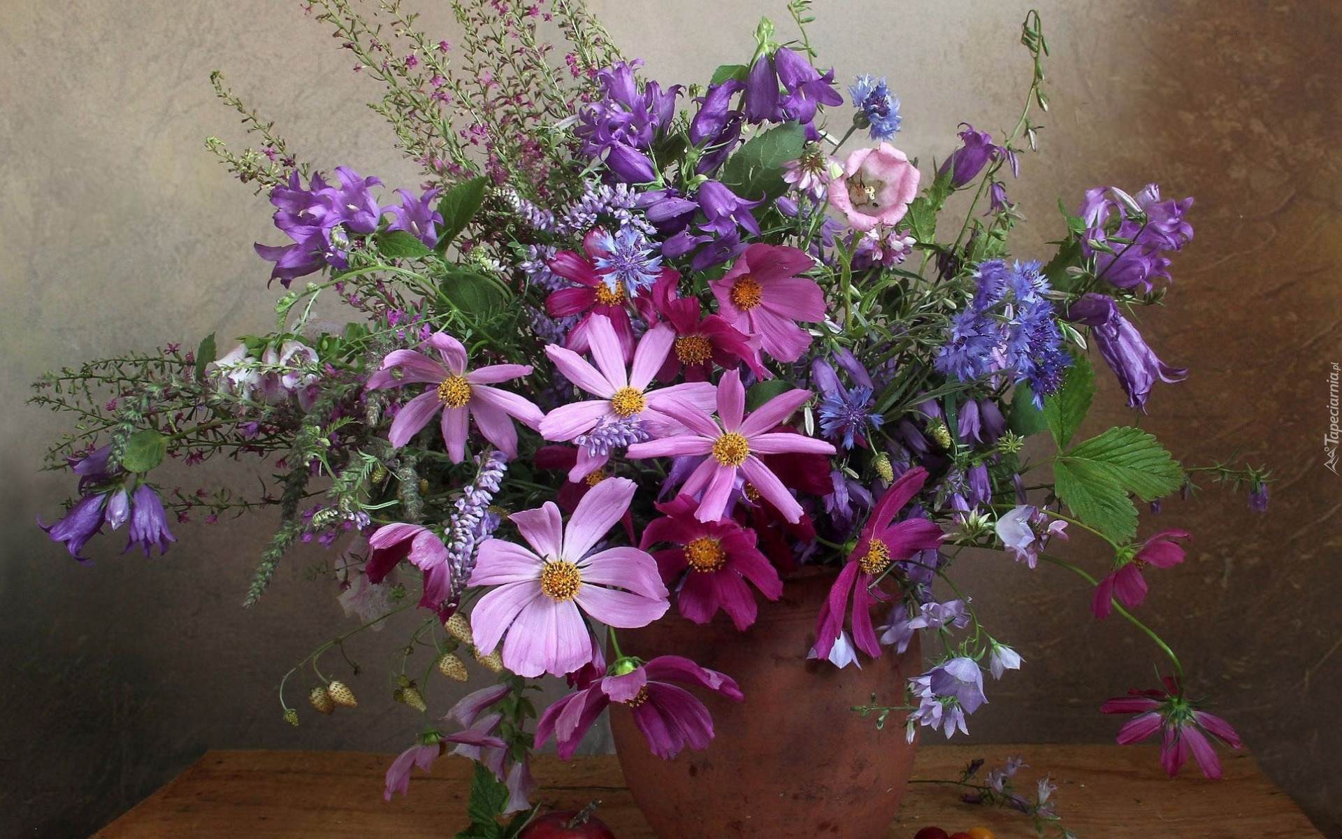 Edytor tapety: Bukiet polnych kwiatów w glinianym wazonie