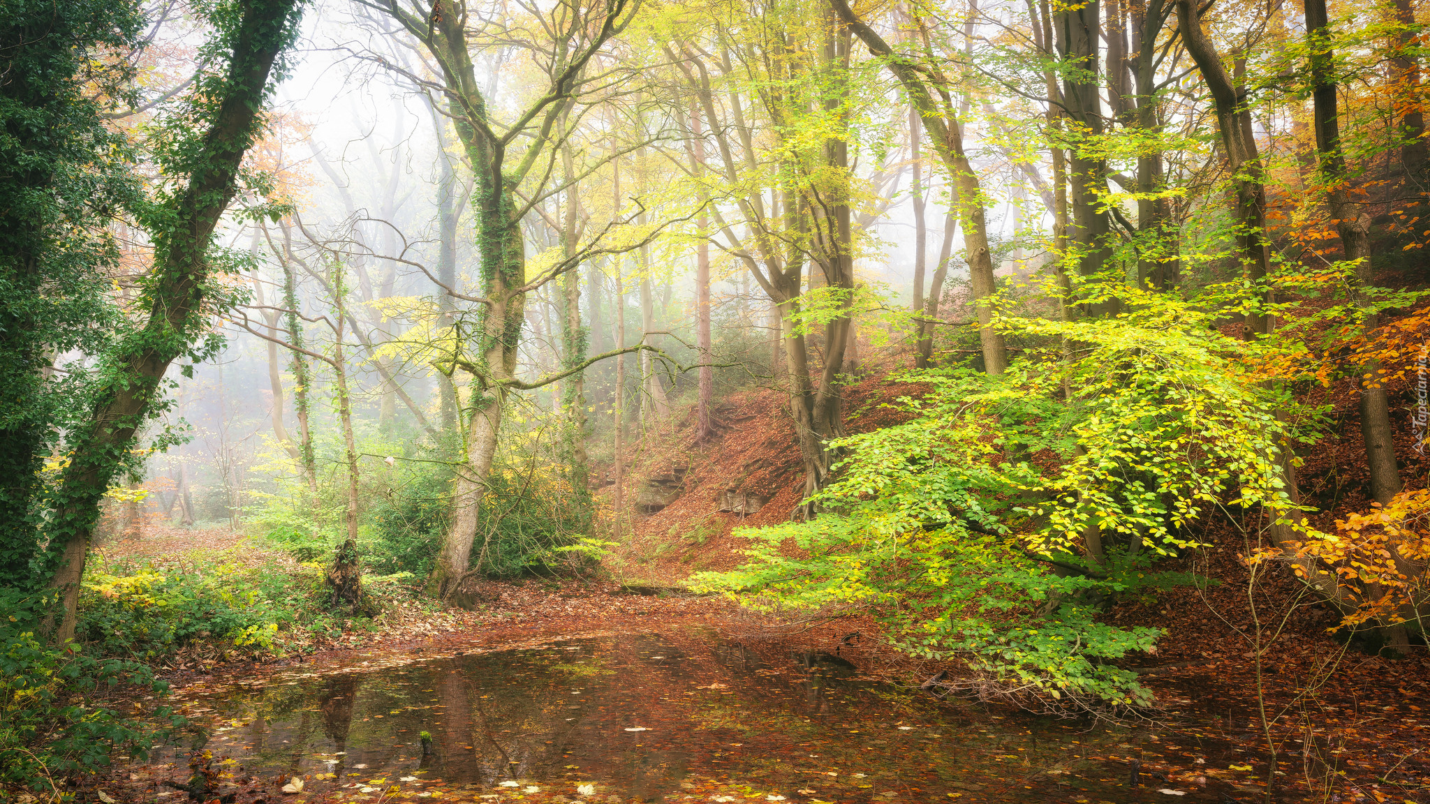 Edytor tapety: Drzewa nad kałużą w zamglonym lesie