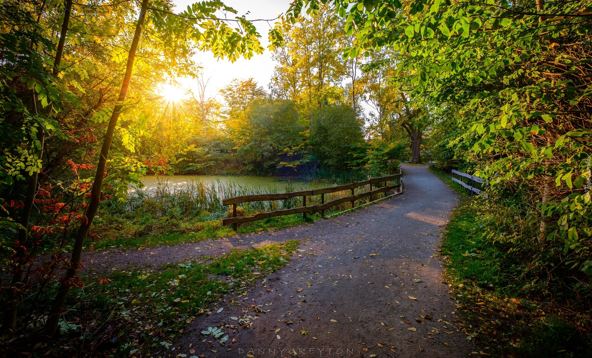 Edytor tapety: Ogrodzenie przy stawie w parku