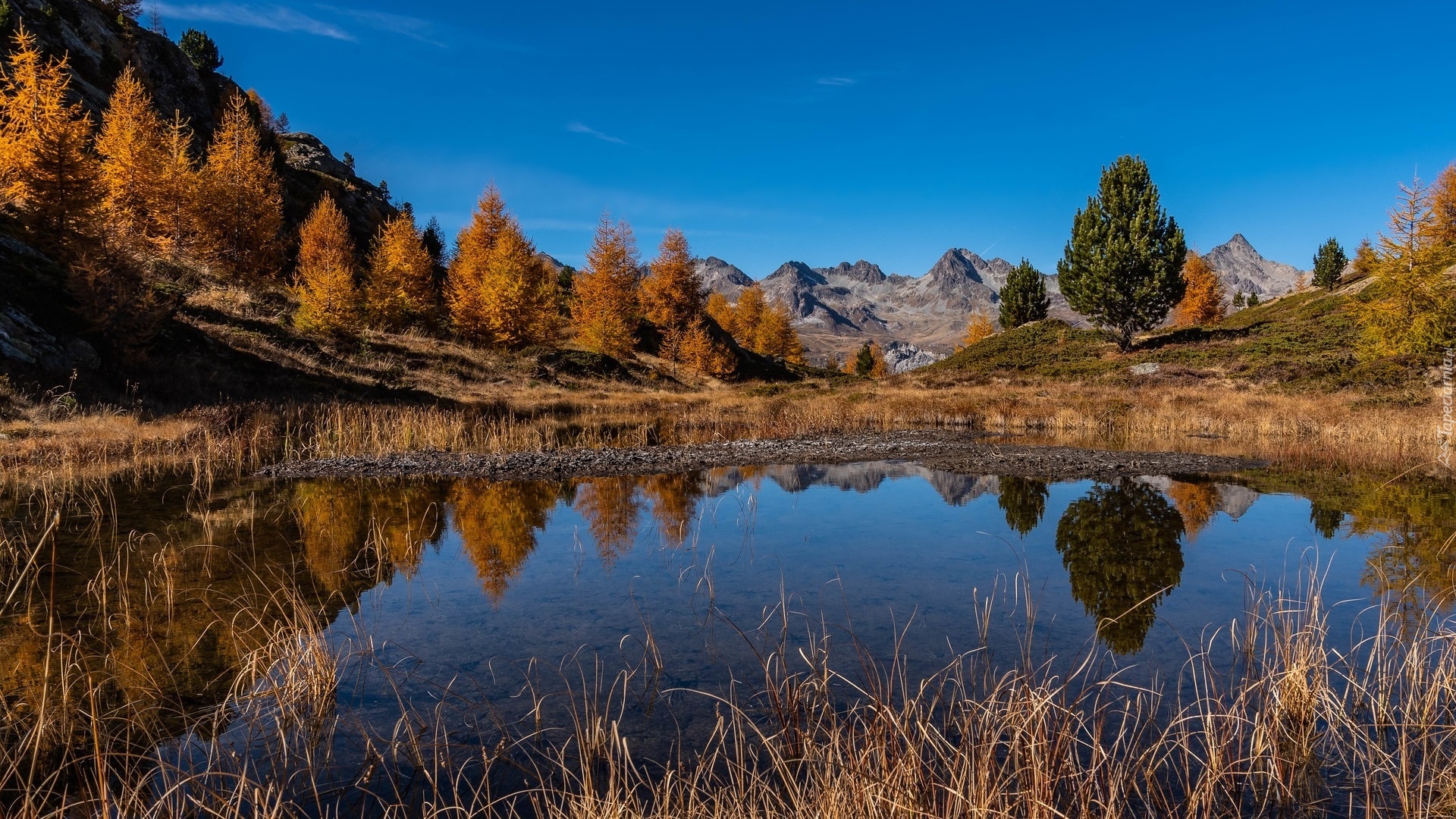 Edytor tapety: Modrzewie na tle gór obok stawu