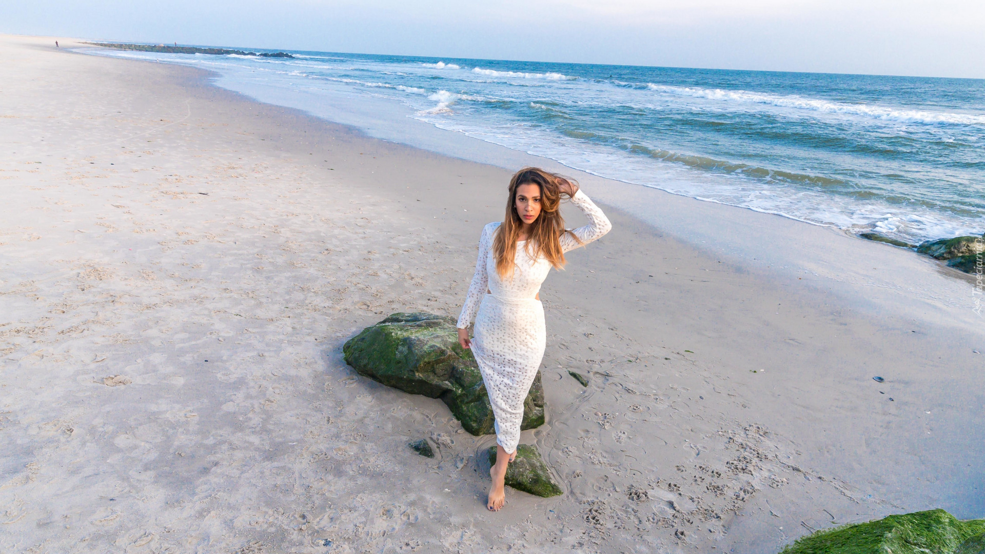 Edytor tapety: Kobieta w białej sukience na plaży