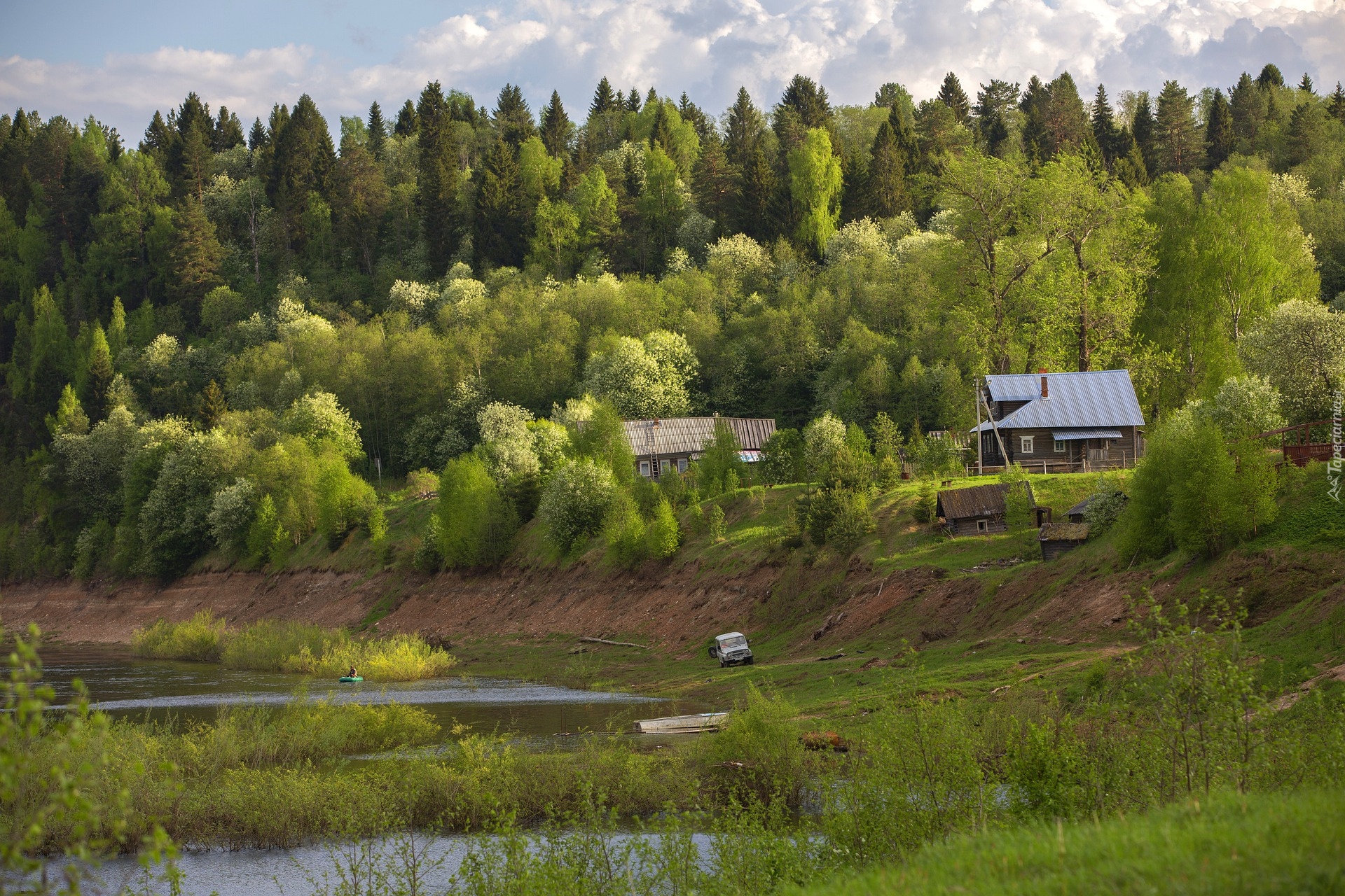 Edytor tapety: Domy i drzewa na wzgórzu nad rzeką