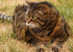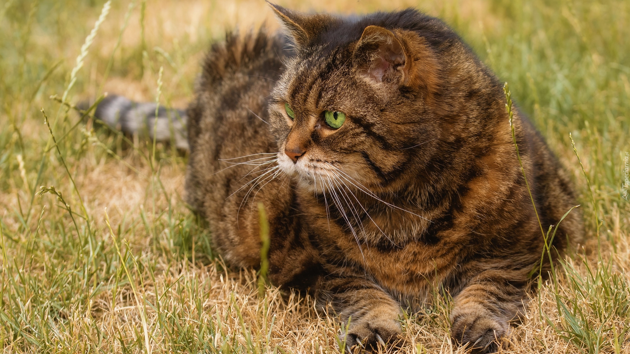 Edytor tapety: Zapatrzony bury kot leżący na trawie