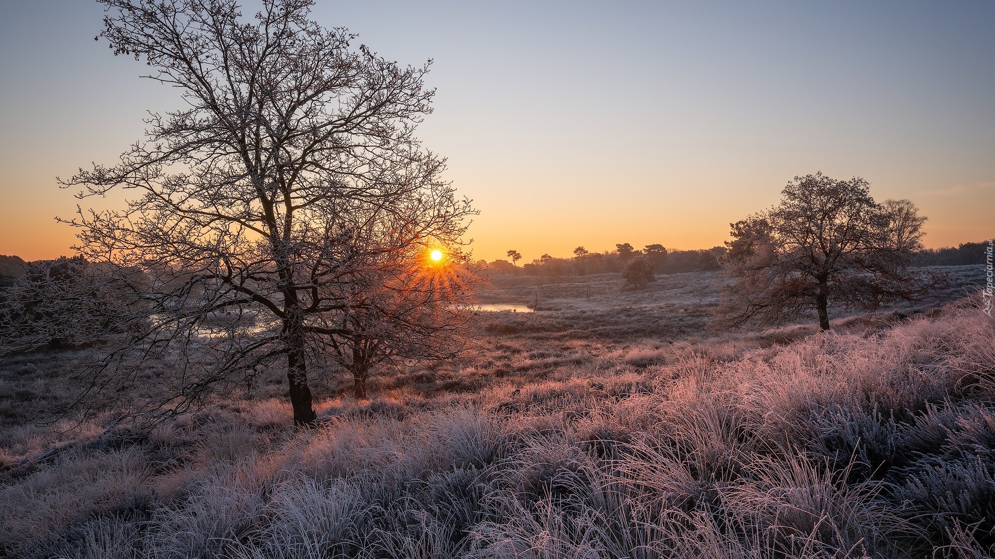 Edytor tapety: Drzewa i oszroniona trawa w promieniach słońca