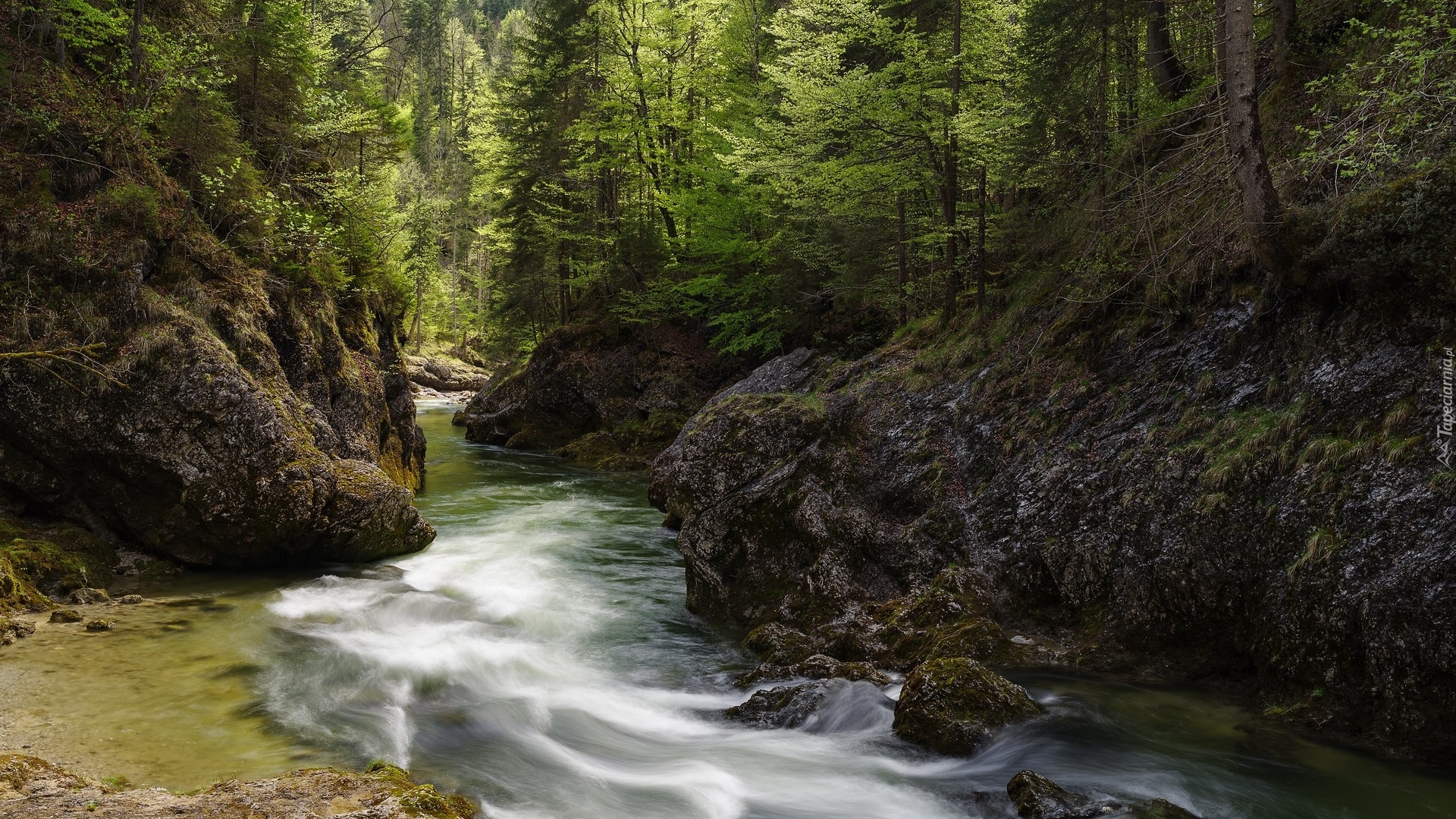 Edytor tapety: Zielone drzewa na skałach po obu stronach rzeki