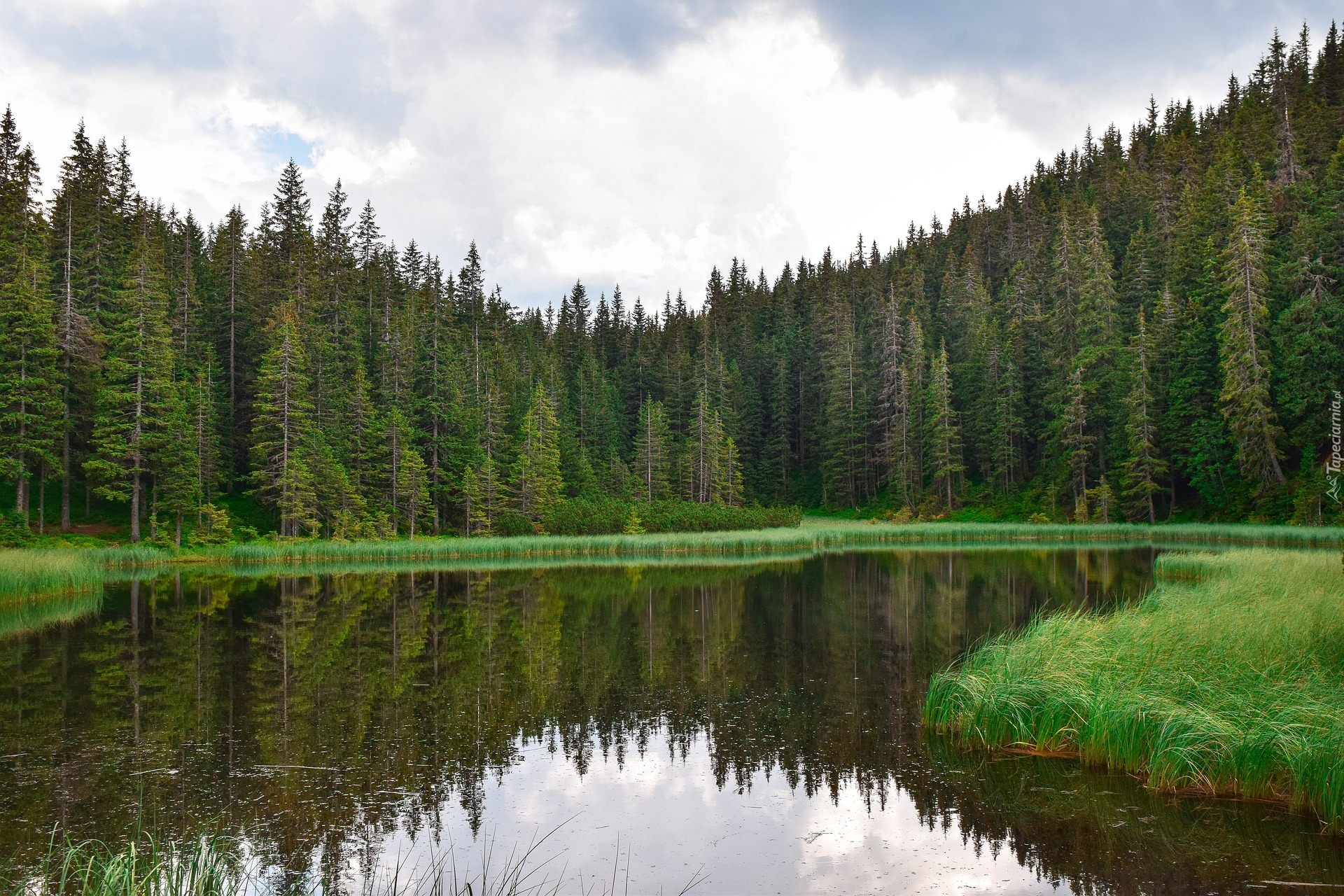 Edytor tapety: Szuwary i las iglasty nad jeziorem