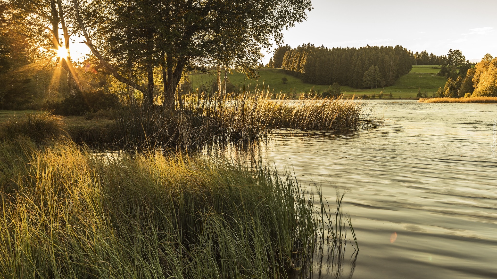 Edytor tapety: Szuwary i drzewa nad rzeką w promieniach słońca