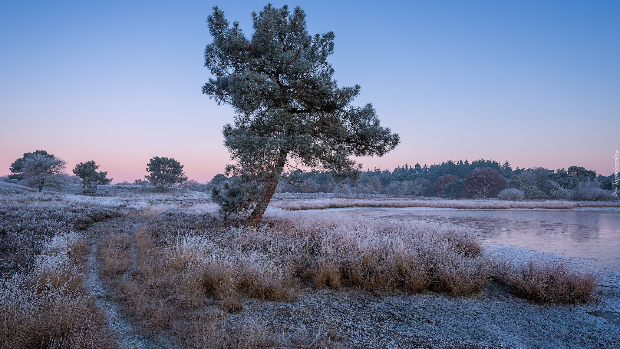 Edytor tapety: Oszronione drzewa i trawa nad jeziorem o poranku