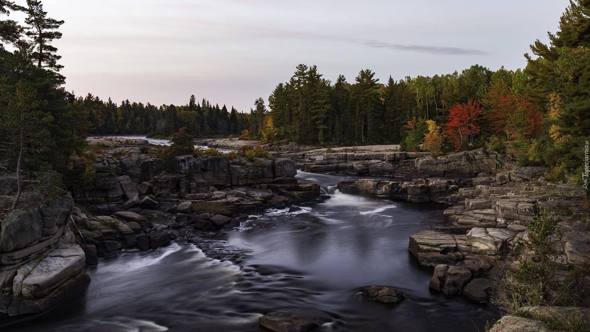 Edytor tapety: Drzewa na skałach nad rzeką