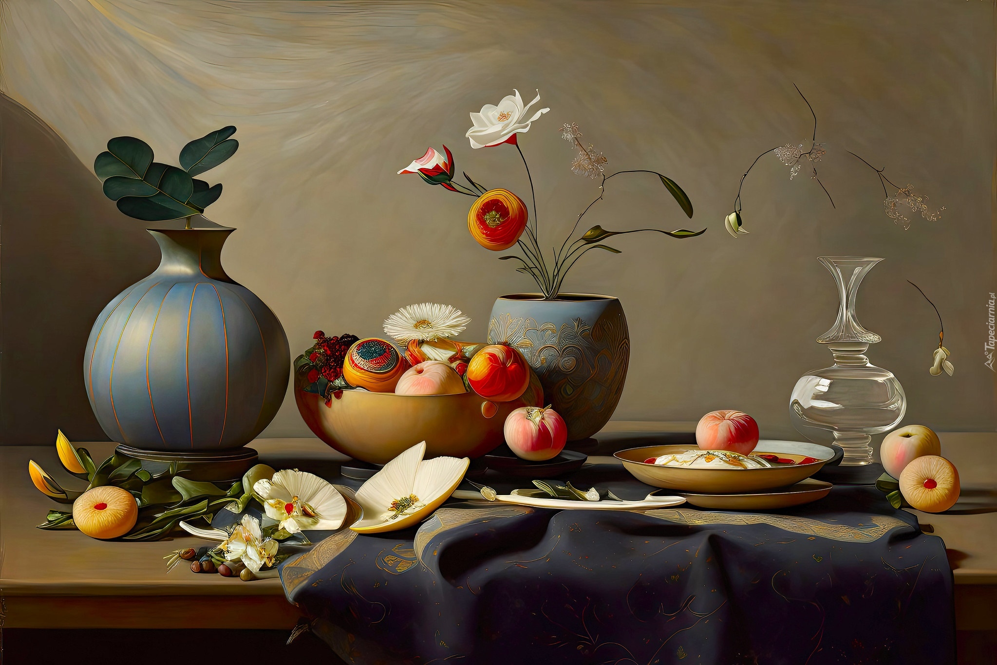 Edytor tapety: Grafika z owocami obok kwiatów w wazonach