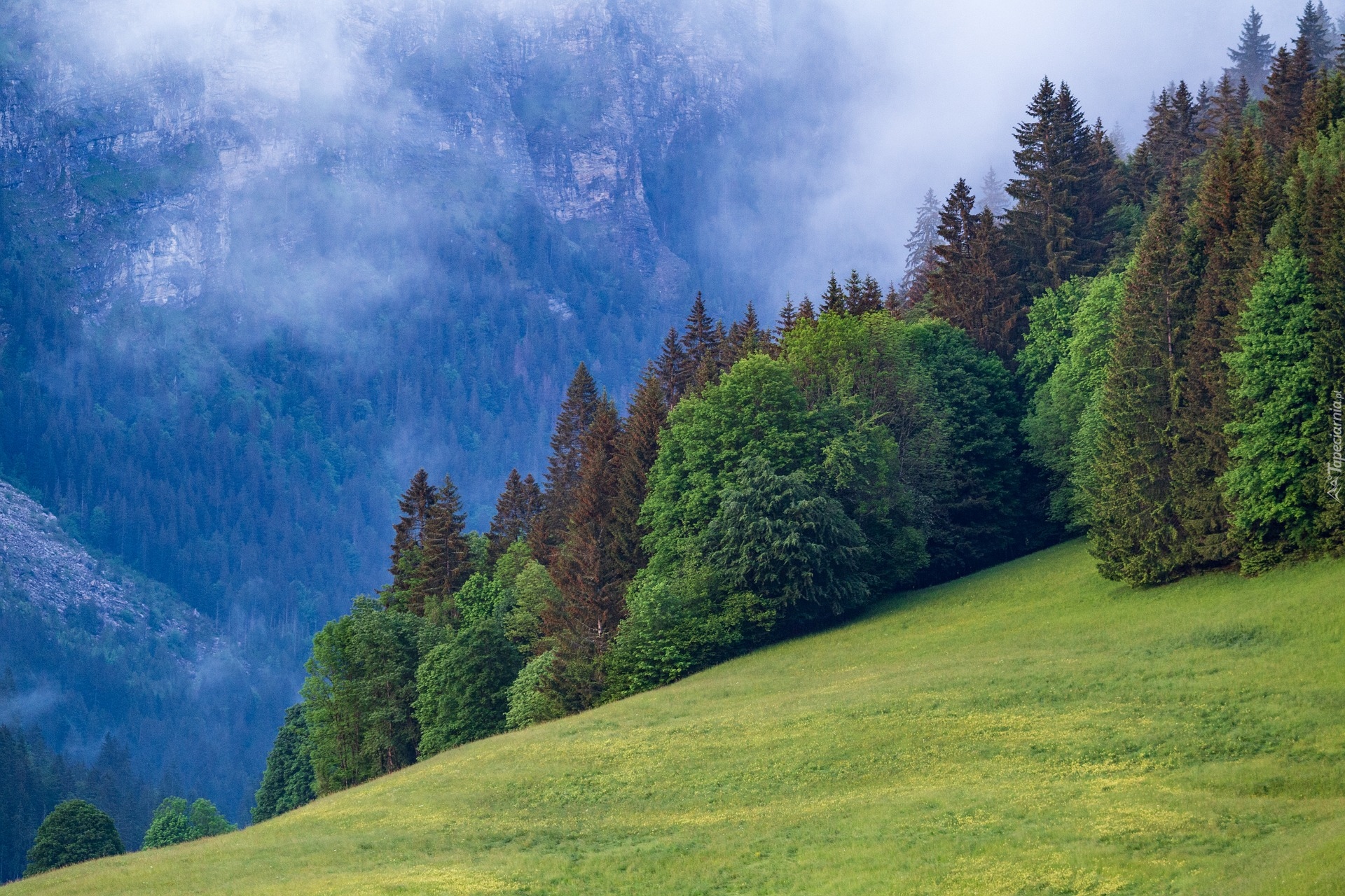 Edytor tapety: Drzewa na stoku i zalesione góry we mgle