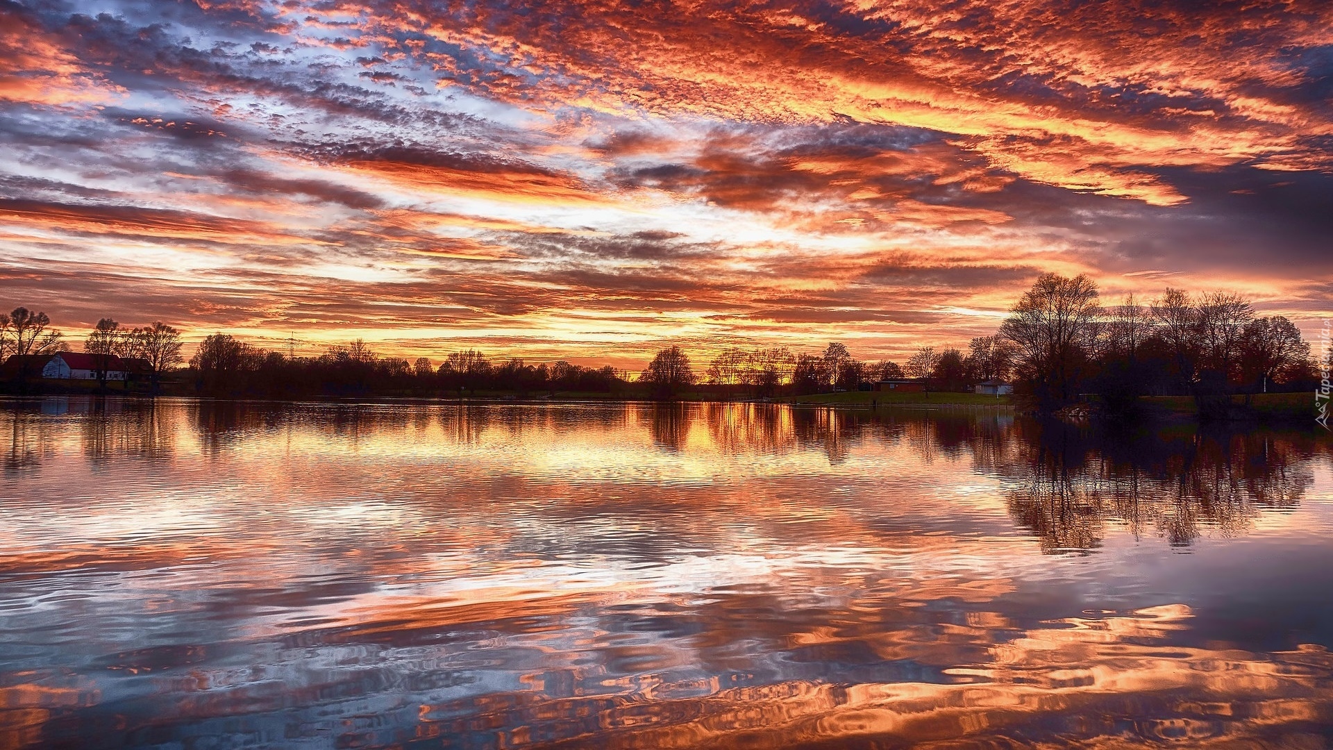 Edytor tapety: Drzewa nad jeziorem pod kolorowym niebem