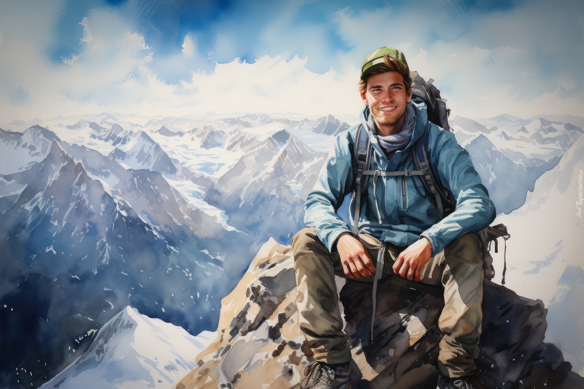Edytor tapety: Uśmiechnięty mężczyzna na tle gór w grafice