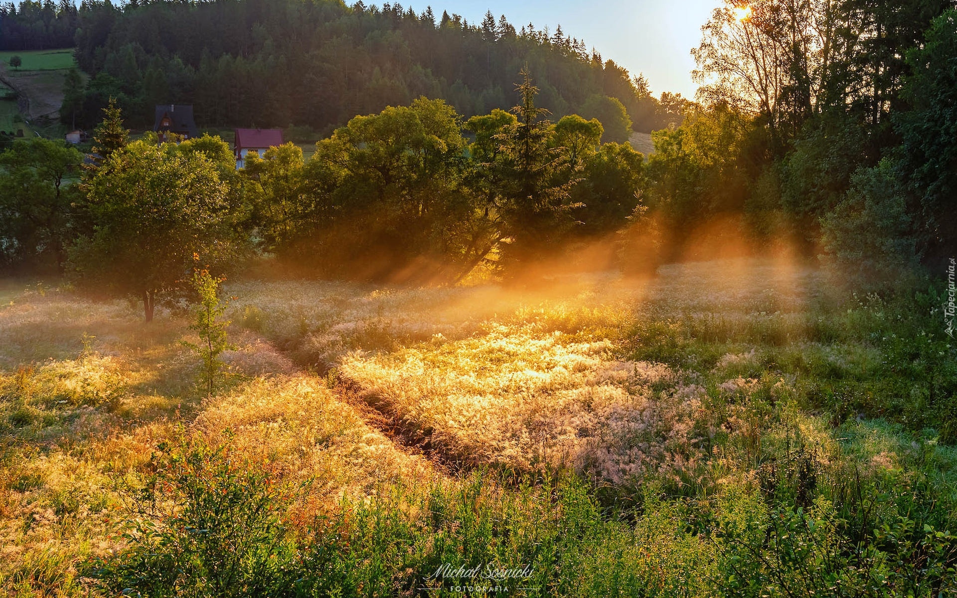Edytor tapety: Łąka i drzewa we mgle o poranku