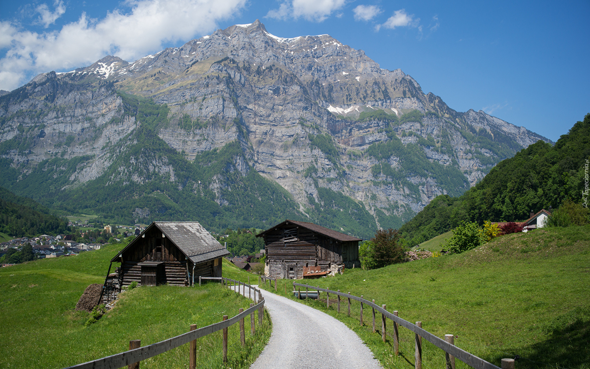 Edytor tapety: Droga prowadząca do domów u podnóża gór